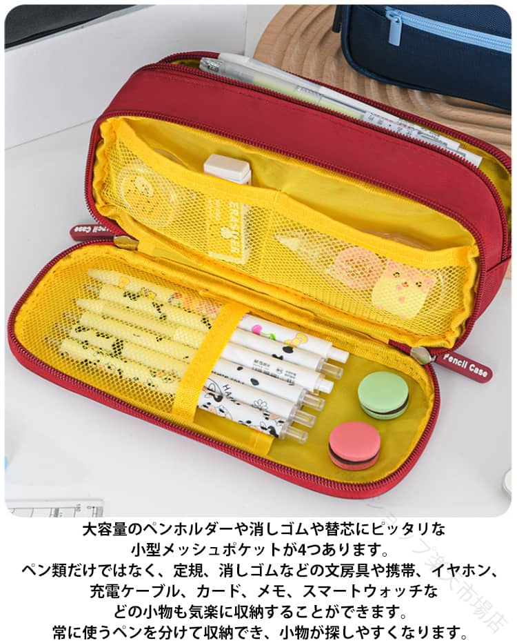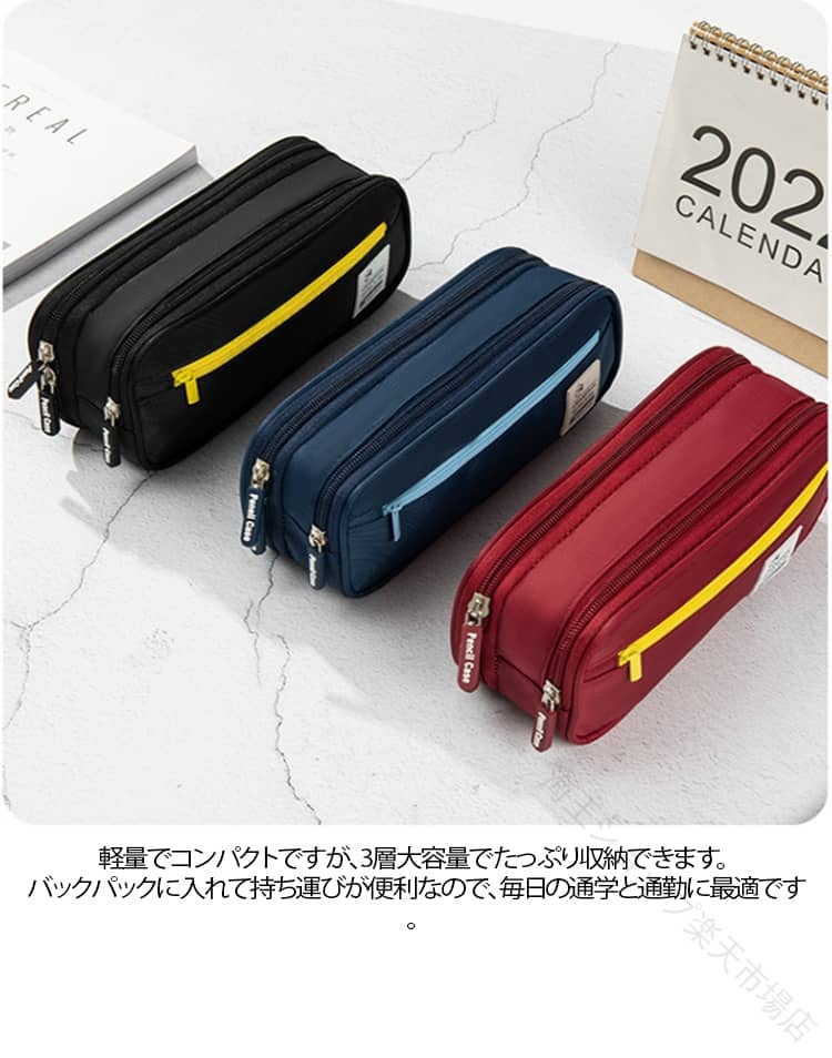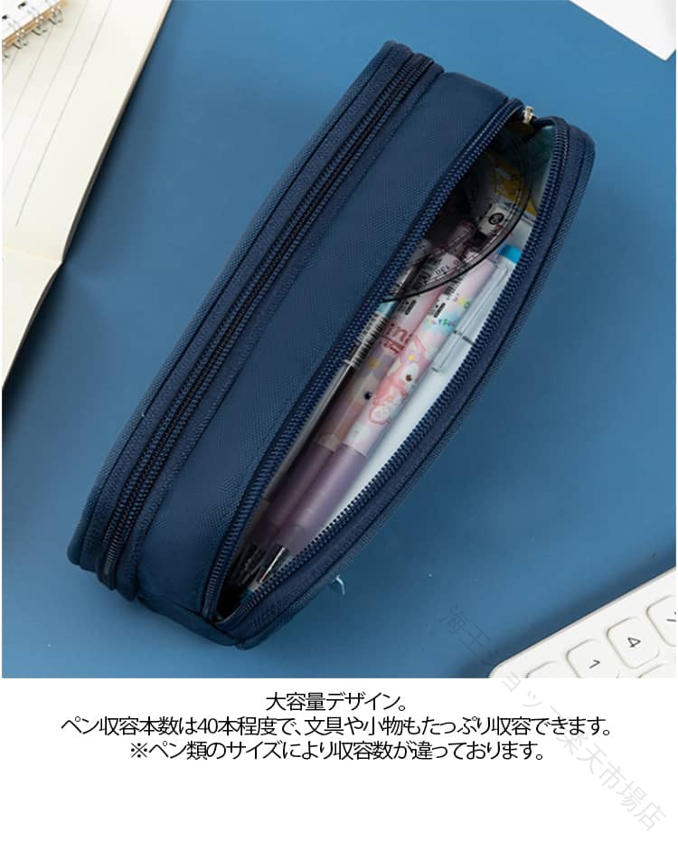 大容量ペンケース大容量デザイン。ペン収容本数は40本程度で、文具や小物もたっぷり収容できます。※ペン類のサイズにより収容数が違っております。大容量のペンホルダーや消しゴムや替芯にピッタリな小型メッシュポケットが4つあります。ペン類だけではなく、定規、消しゴムなどの文房具や携帯、イヤホン、充電ケーブル、カード、メモ、スマートウォッチなどの小物も気楽に収納することができます。常に使うペンを分けて収納でき、小物が探しやすくなります。水や汚れに強い撥水加工生地を使用し、耐久性が高くて、文具をしっかりと保護します。ダブルジッパーで便利に開閉でき、すべらかなダブルファスナーはスムーズな開閉になります。ファスナーを開けると見やすい大口径式になるので、収納しているもの全体が直ぐに見つかりので使いやすくて便利です。軽量でコンパクトですが、3層大容量でたっぷり収納できます。バックパックに入れて持ち運びが便利なので、毎日の通学と通勤に最適です。