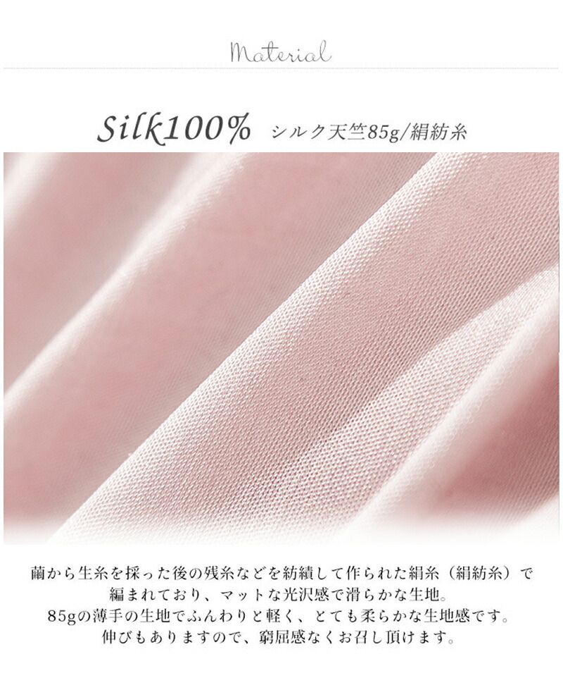 シルクの優雅な光沢と軽やかな履き心地が特徴で、サラサラとした感触が持続します。