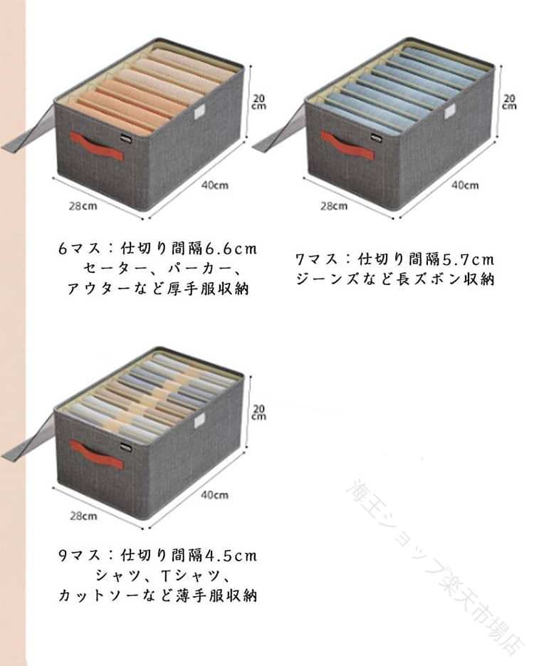 40*27*20cm6マス:仕切り間隔6.6cm セーター、パーカー、アウターなど厚手服収納 7マス:仕切り間隔5.7cm ジーンズなど長ズボン収納 9マス:仕切り間隔4.5cm シャツ、Tシャツ、カットソーなど薄手服収納 ※サイズ表の実寸法は商品によって1-3cm程度の誤差がある場合がございます。