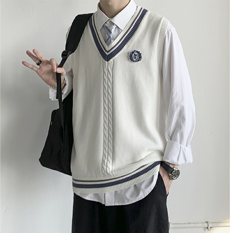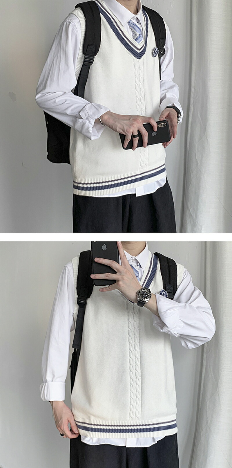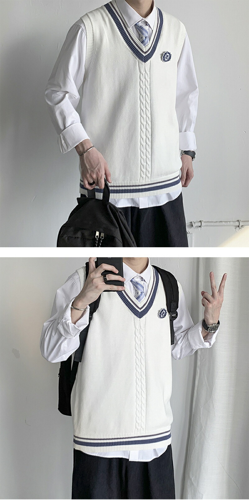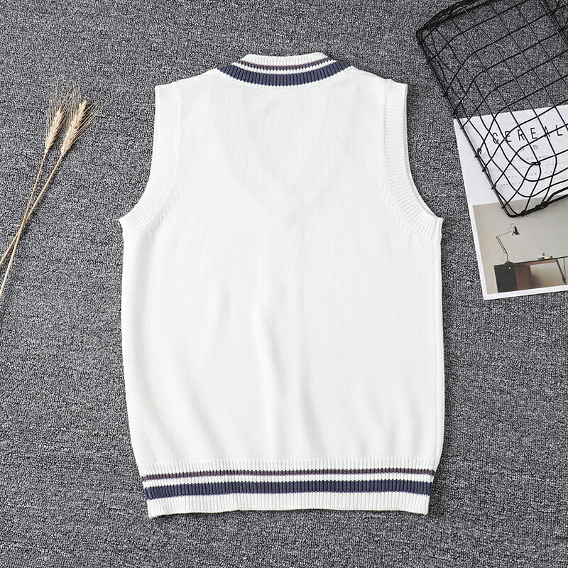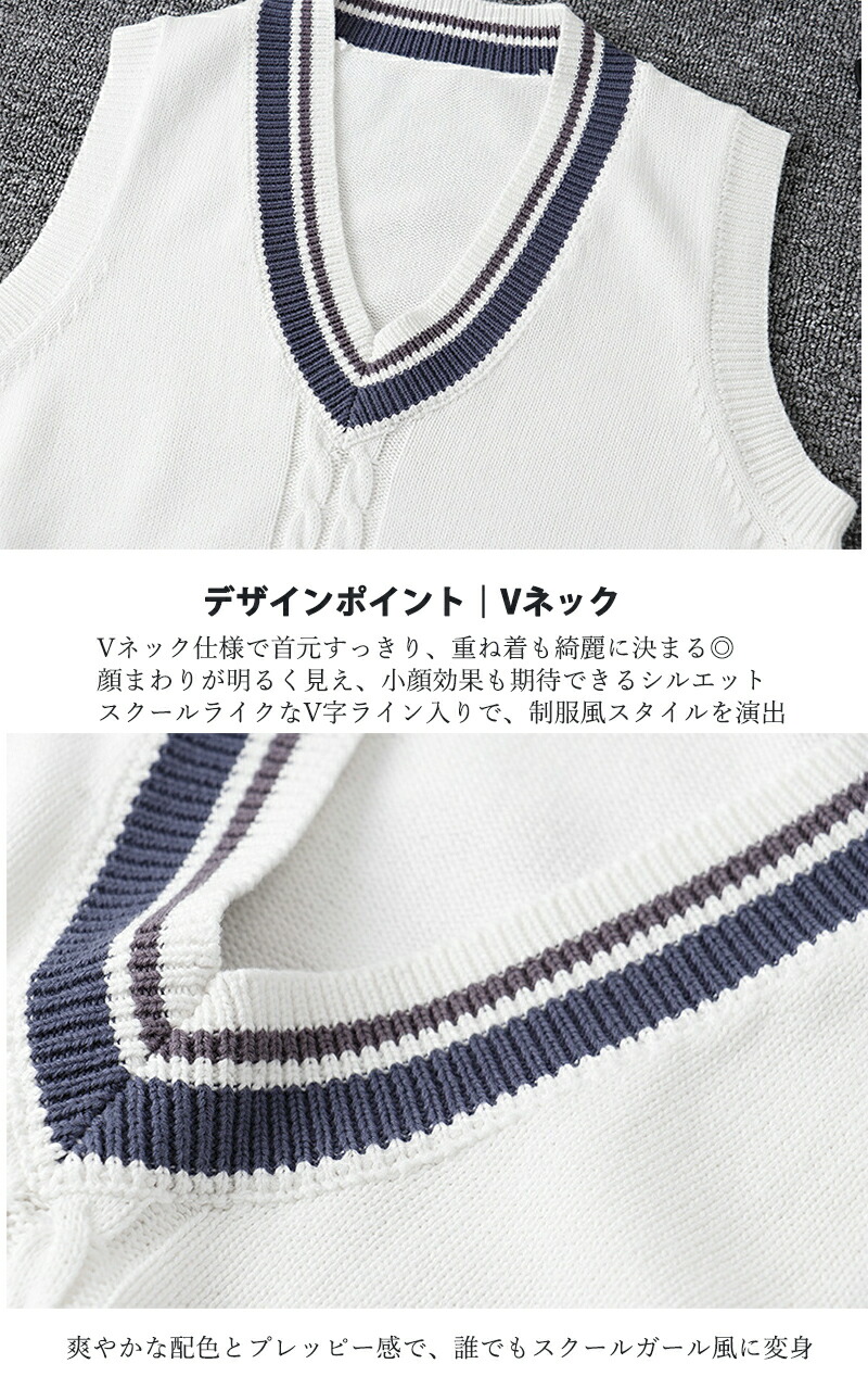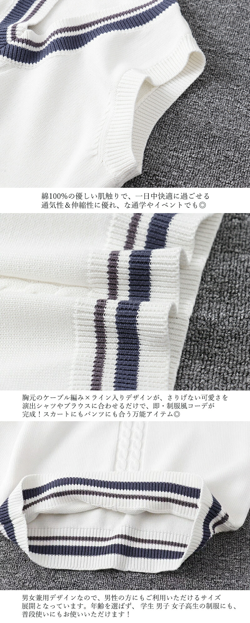 スクール ベスト 学生 綿 ライン入り フォーマル ニットベスト Vネック ホワイト ケーブル編み 年間使いやすい 男女兼用 ユニセックス セーター 制服 学生服 高校 学校 小学生 通学 キ 中学生