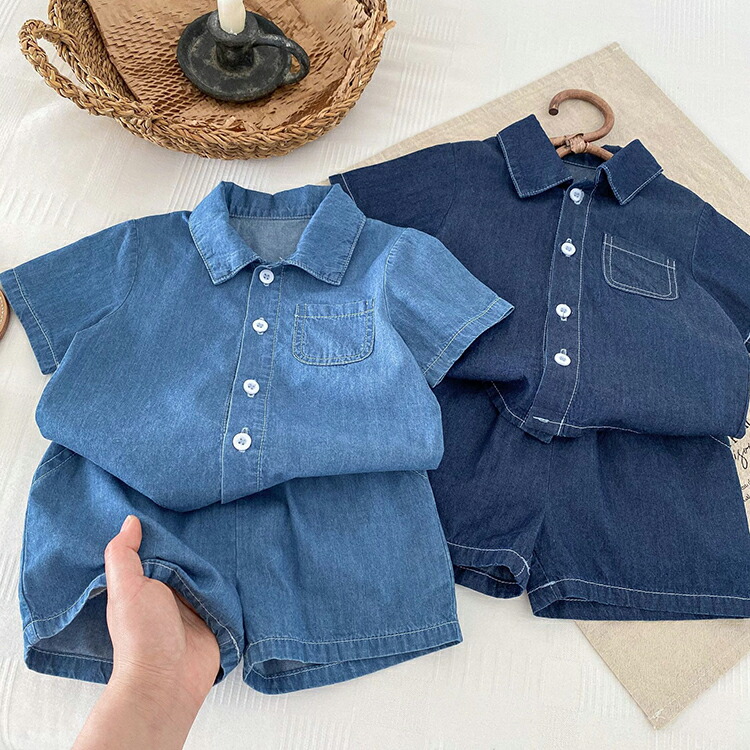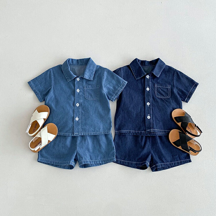 涼しげな半袖シャツとショートパンツがセットになった、キッズ用デニムセットアップです。