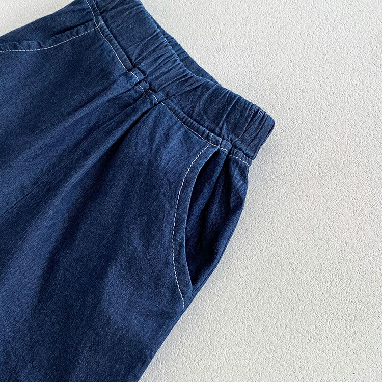 ゴワゴワしない、薄手で柔らかいデニム風生地を使用しています。通気性が良くサラッとした肌触りで、汗っかきな子供たちでも暑い夏を快適に過ごせます。