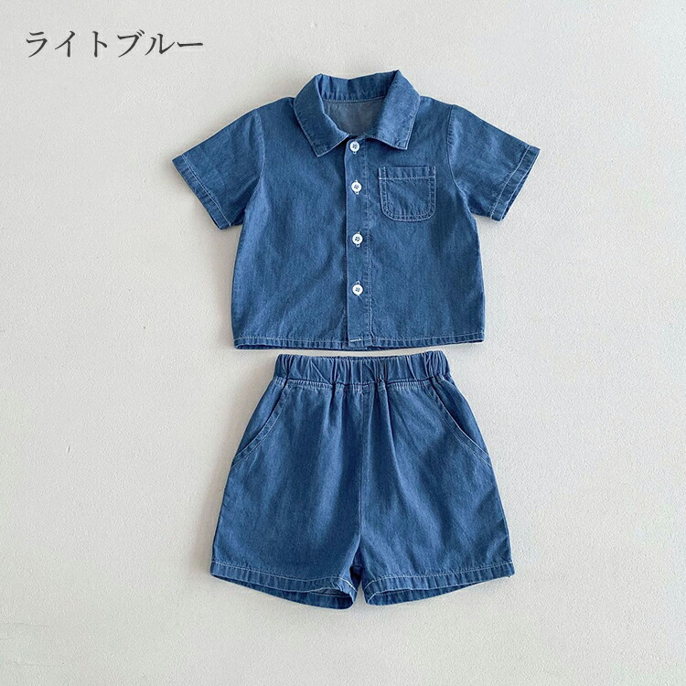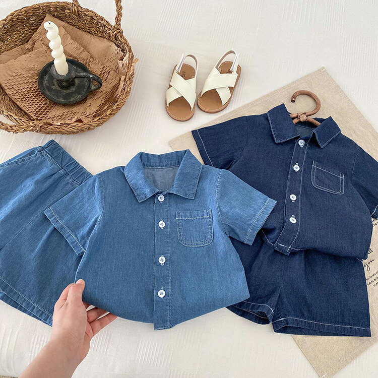 キッズ デニム セットアップ 短パン 2点セット 子供服 女の子 男の子 兄弟 姉妹 上下セット 春夏 シャツ ショートパンツ 半袖 ボタン 前開き ゴム入り カジュアル 可愛 おしゃ 韓国風