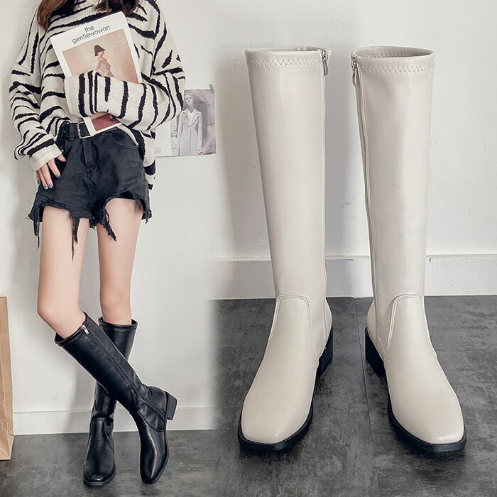 レディース 黒 白 ジョッキーブーツ レディース ロングブーツ ニーハイブーツ チャンキーヒール ローヒール