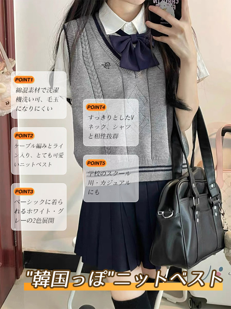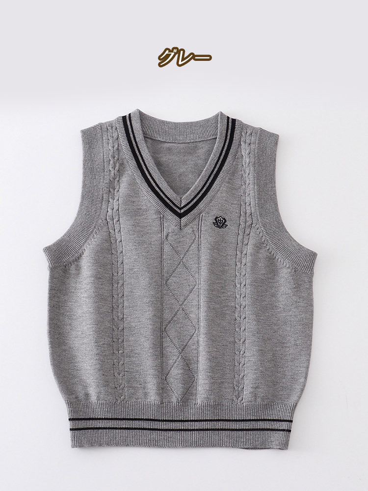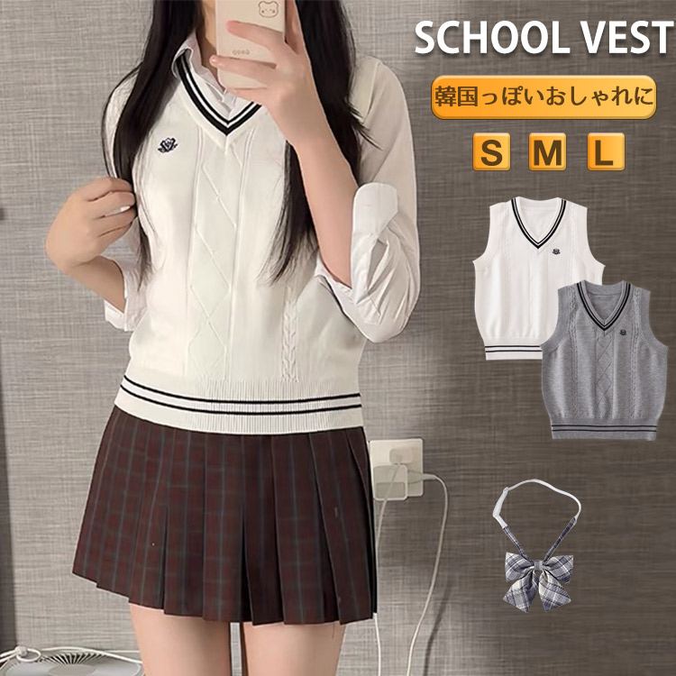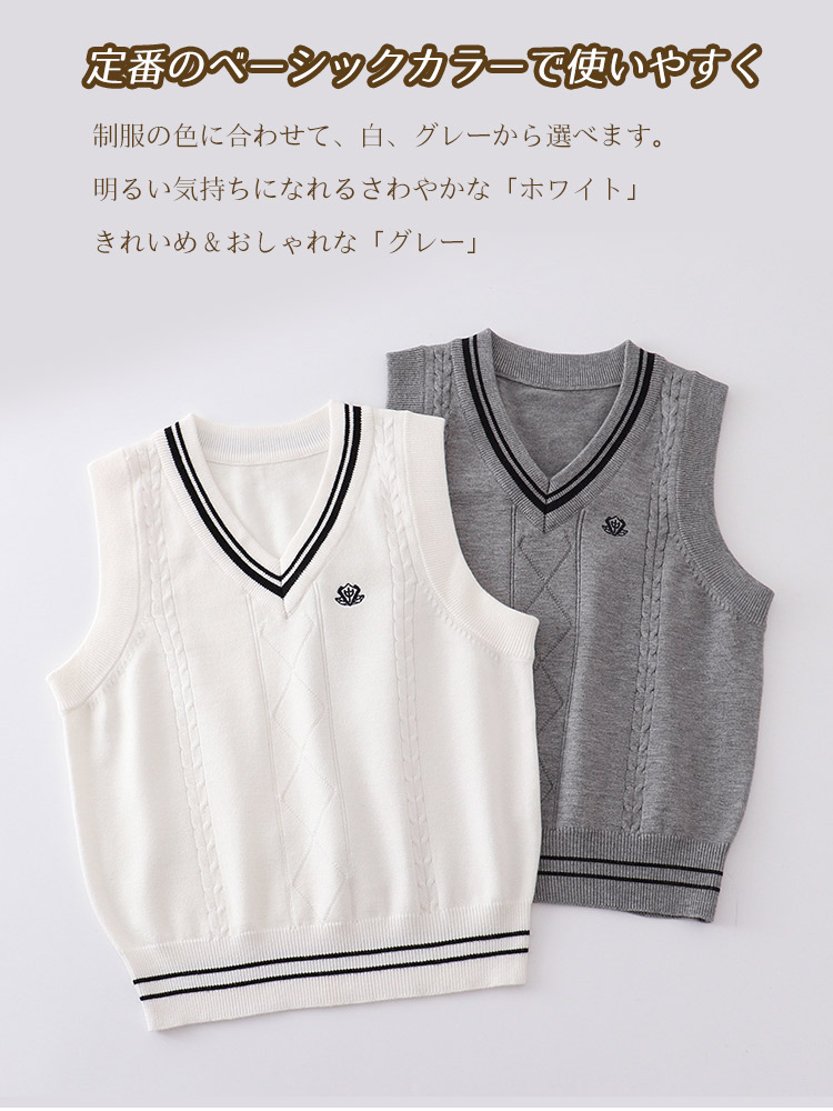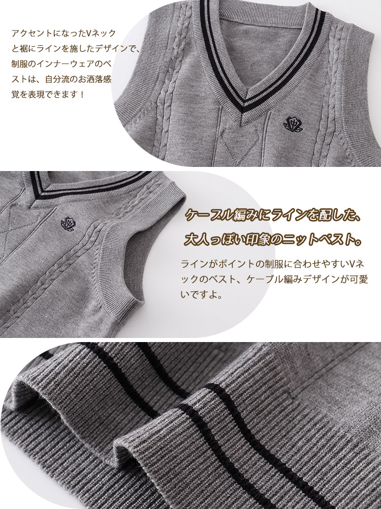 スクールベスト ニットベスト ライン入り グレー ホワイト ケーブル編み Vネック レディース 春 レイヤード トップス セーター 学生服 JK 女子高生 高校 通学 学校 スクー 中学