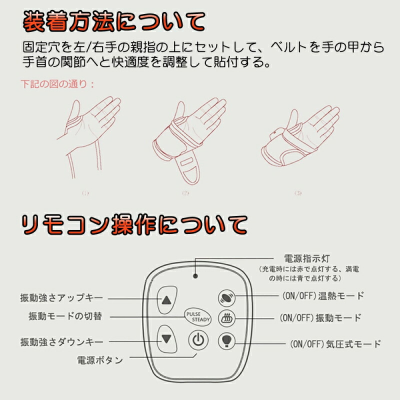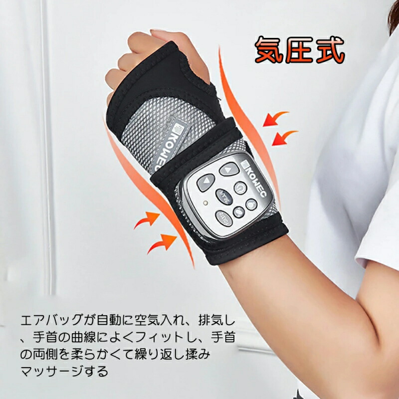 【気圧式、温熱機能】気圧式、温熱、振動機能が搭載している1台3役ハンドマッサージ機です。内蔵されたエアバッグがあり、手首の曲線によくフィットし、手首の両側を柔らかくてエア揉み繰り返します。温熱機能が付き、赤外線療法に従って45度の温感でぽかぽかする