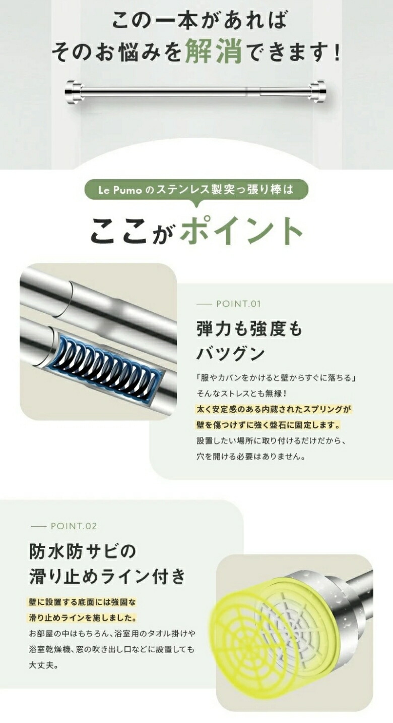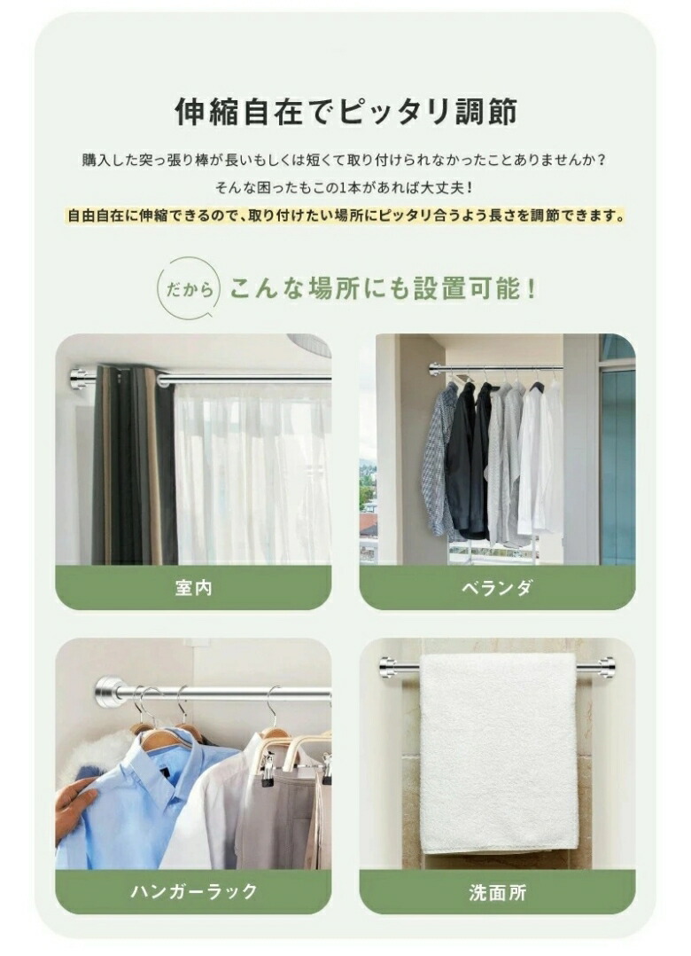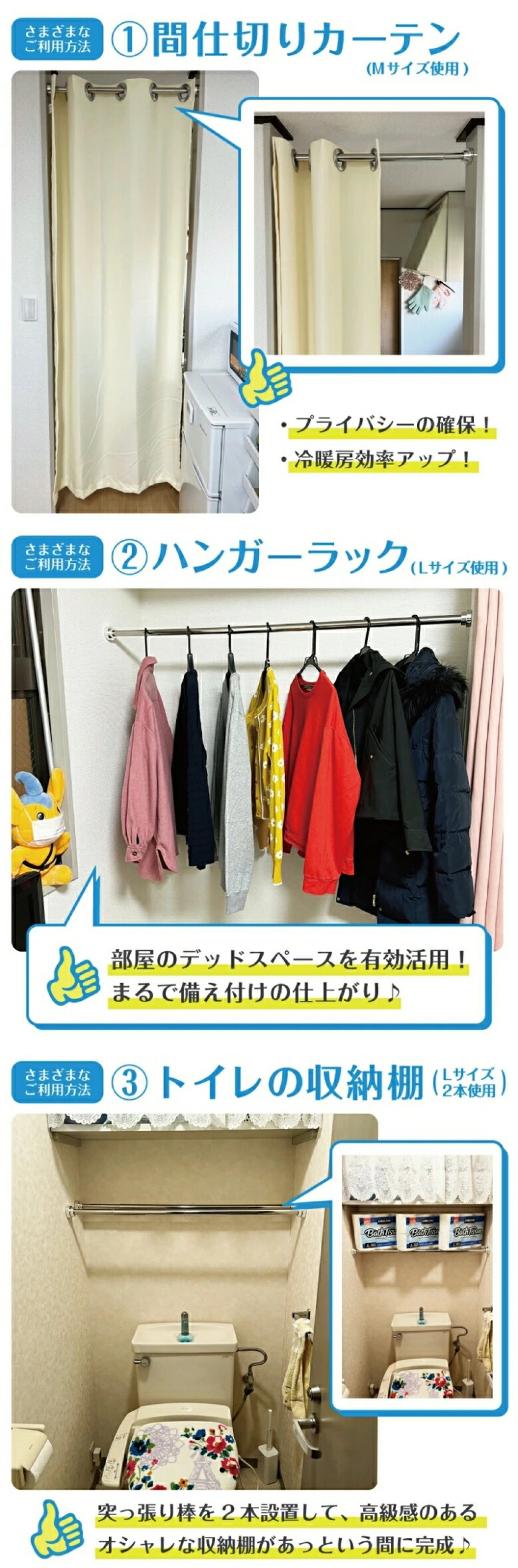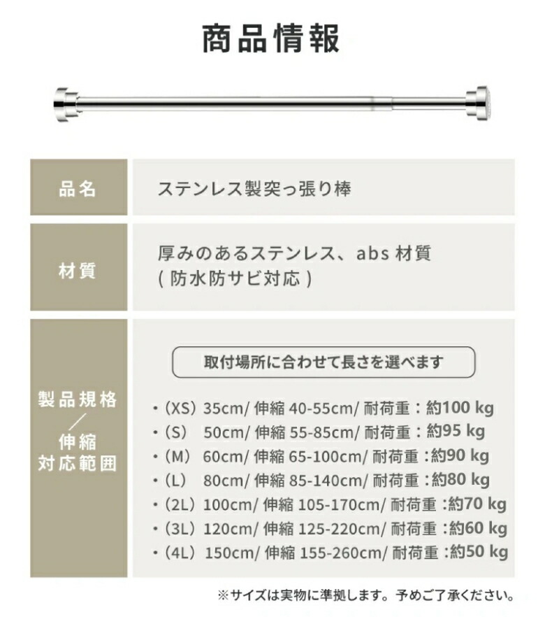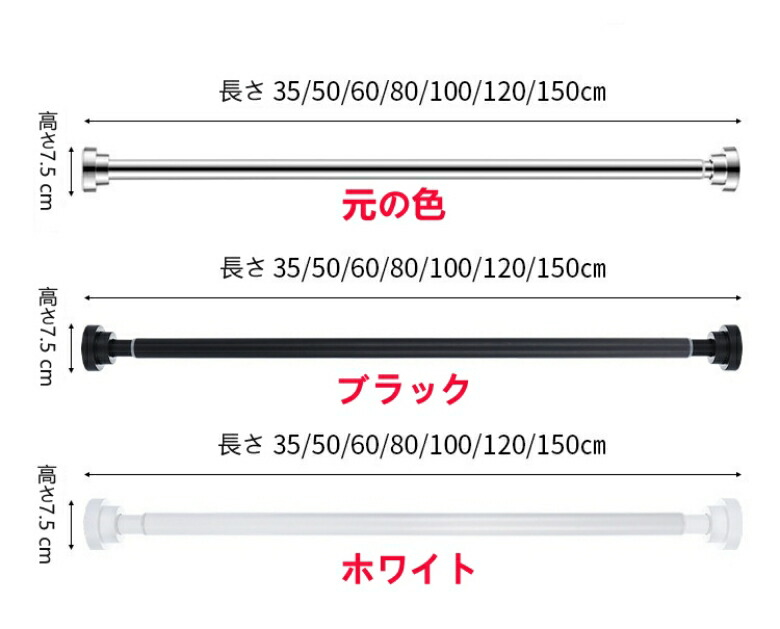 突っ張り棒 2m以上 ステンレス 強力 元の色 ブラック ホワイト 35cm(伸縮範囲約40cm~55cm) 50cm(伸縮範囲約55cm~85cm) 60cm(伸縮範囲約65cm~100cm) 80cm(伸縮範囲約85cm~140cm) 100cm(伸縮範囲約105cm~170cm) 120cm(伸縮範囲約125cm~220cm)