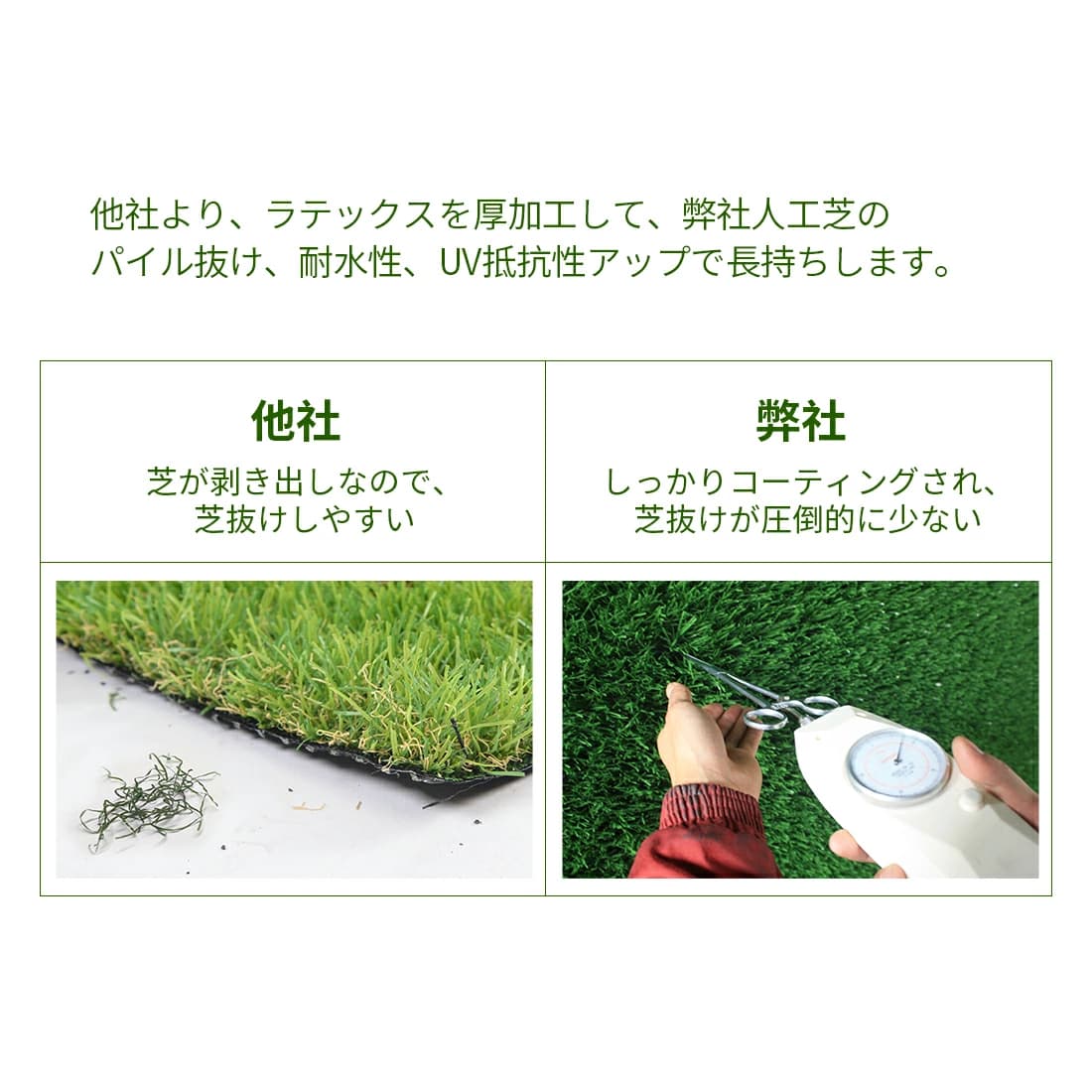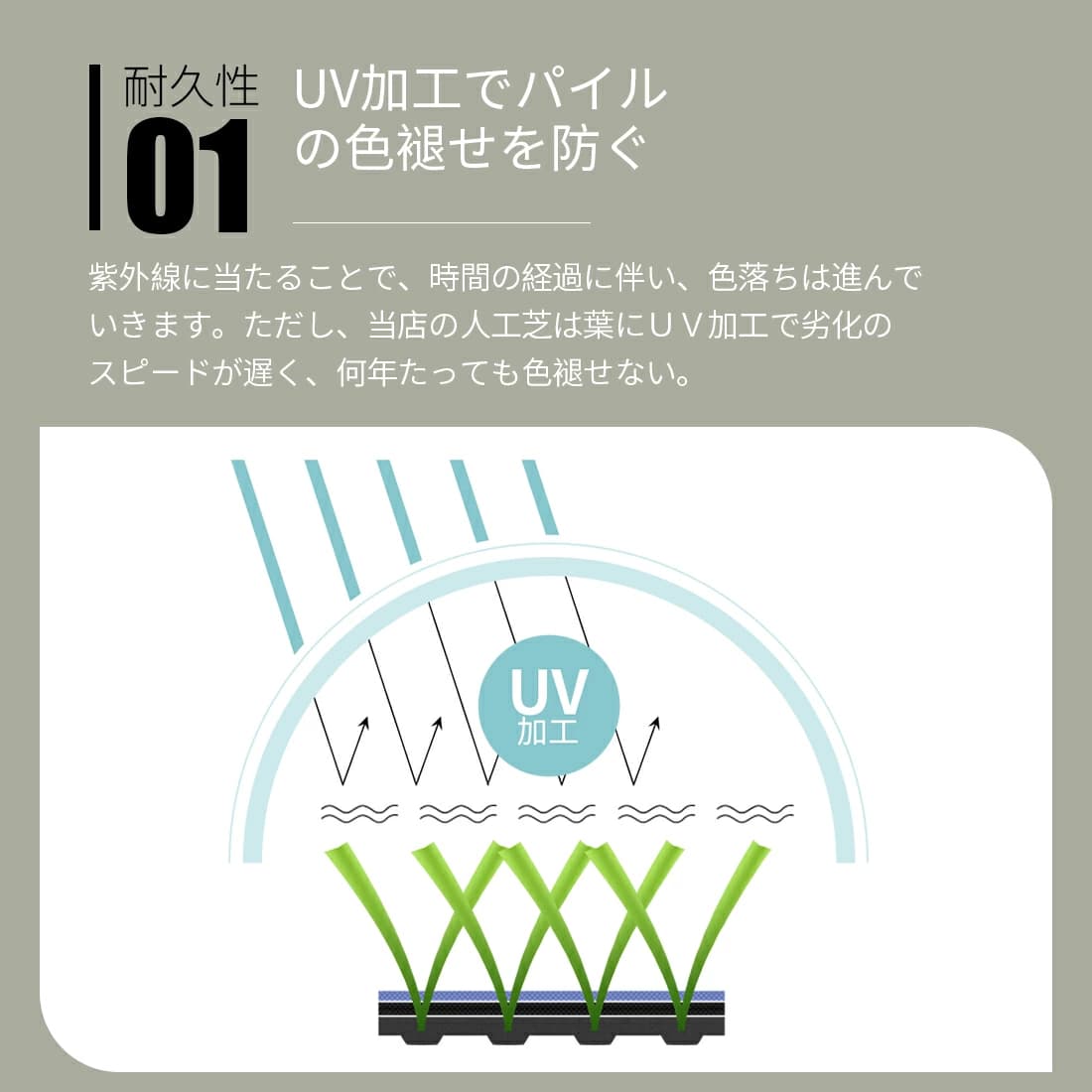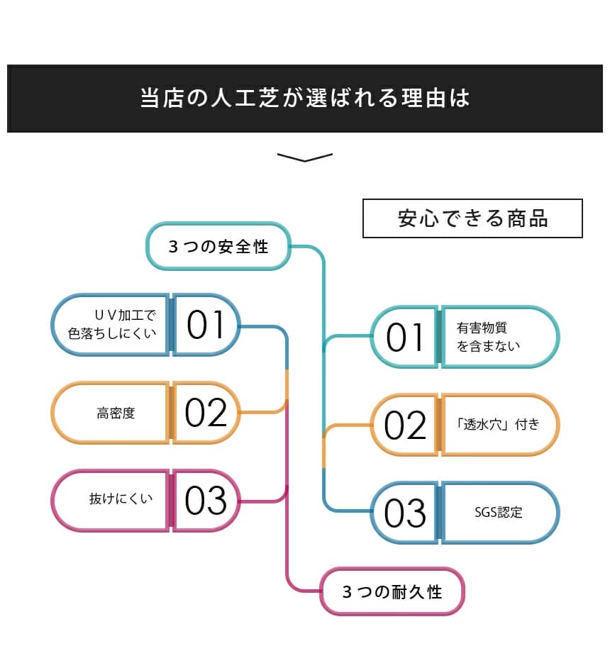 ただし、当店の人工芝は葉にUV加工で劣化のスピードが遅く、短期間で急激に色落ちすることはありません。