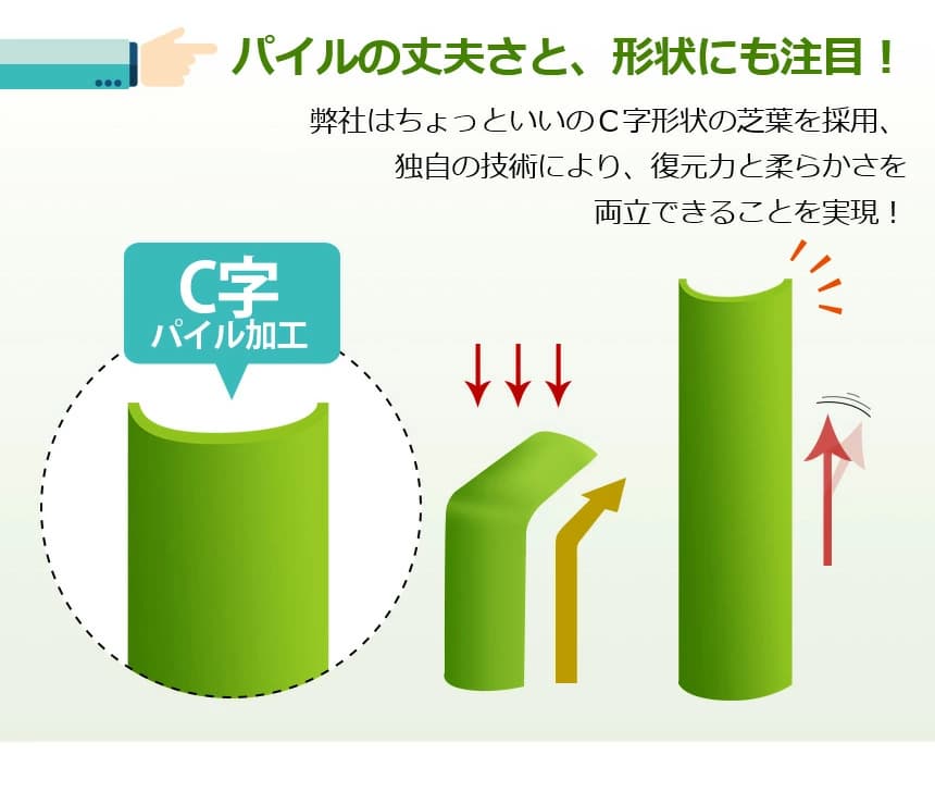 1.ストレートパイル:濃い緑 鮮やかな緑色で一年中芝をきれいに見せてくれます。