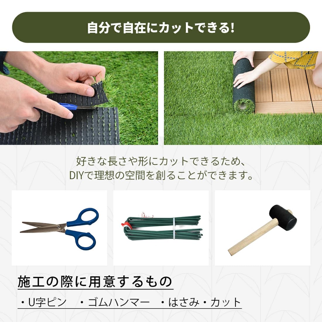 ※人工芝は巻いた状態でのお届けとなりますので、巻き癖や寝癖がある場合もあります。こちらは直射日光に当てることで数日すると元に戻ります。また、折ジワにつきましては、場合によっては取れない可能性もございます為、ご了承の程お願い致します。