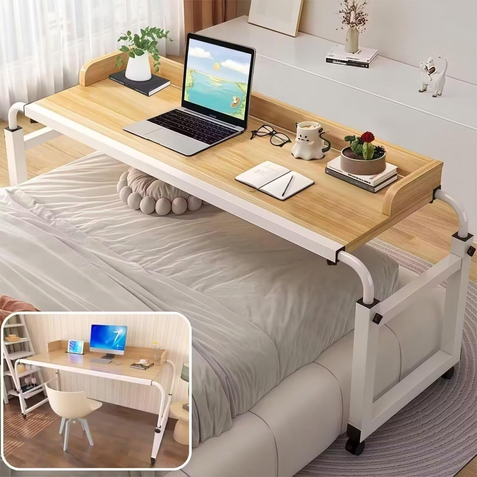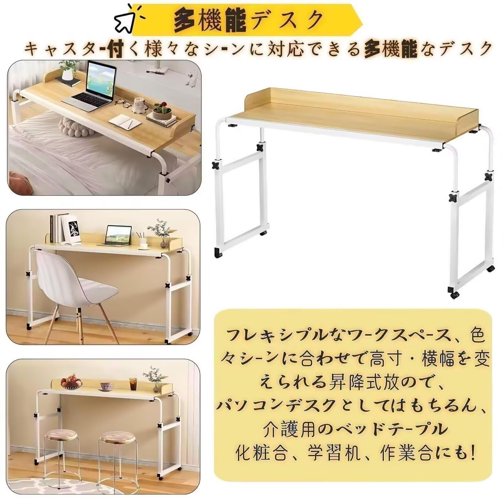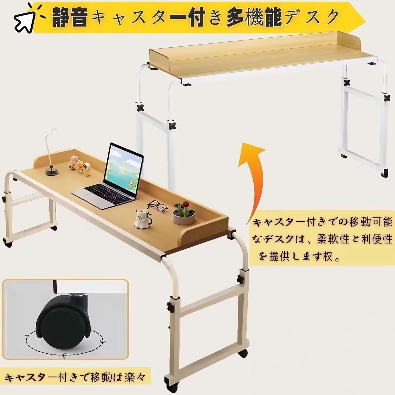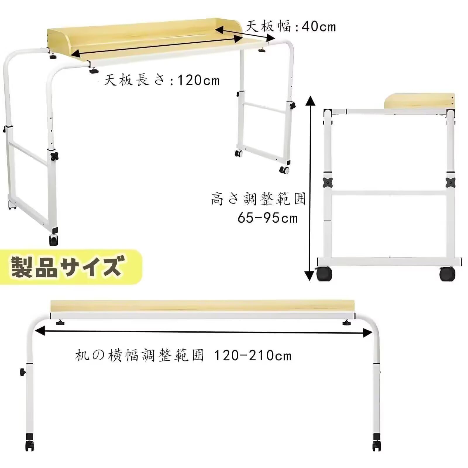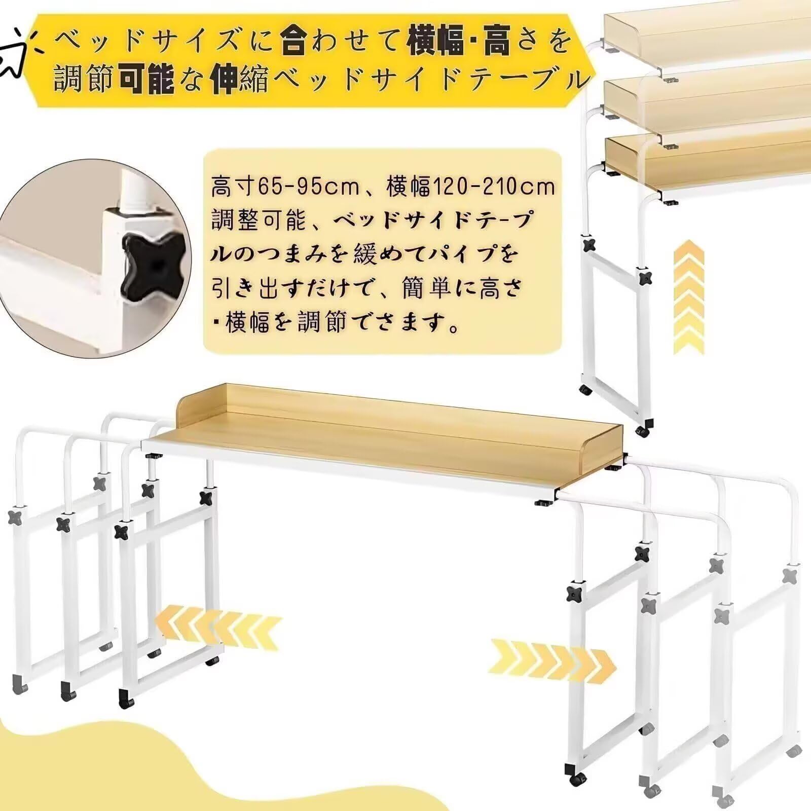 ベッドテーブル キャスター付き オーバーベッドテーブル 伸縮 高さ調整65-95cm 横幅調整120-210cm 昇降式 サイドテーブル 机の幅は広い パソコンデスク リモートワークデ 移動はスムーズ