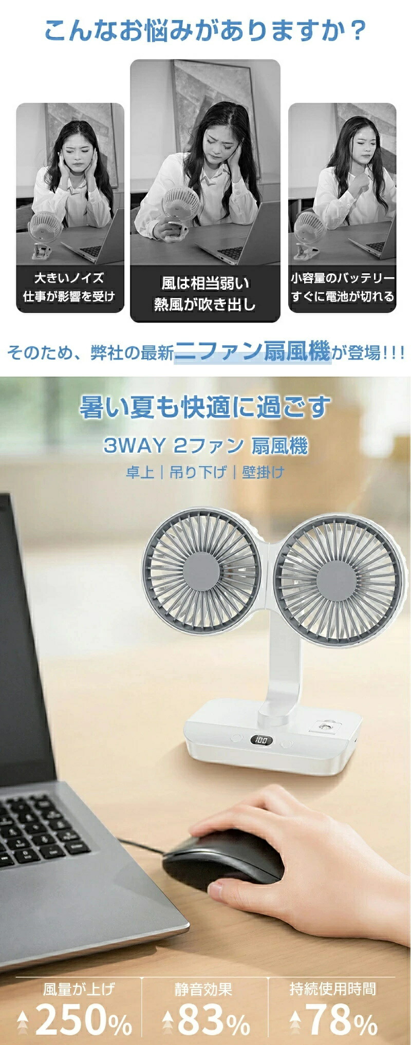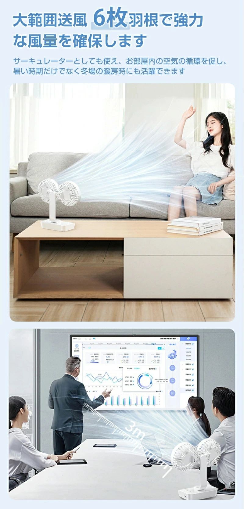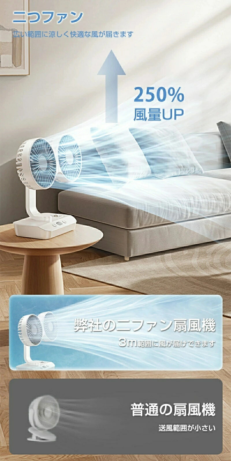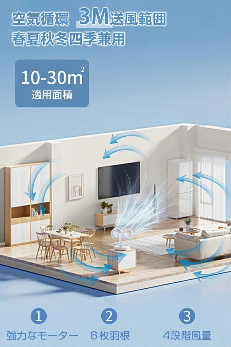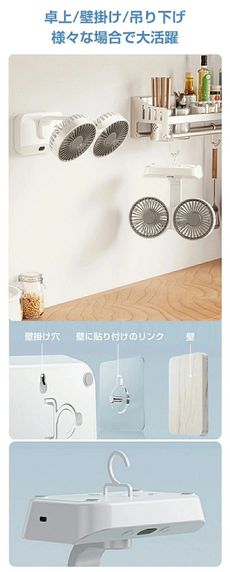 サーキュレーター 2連 車載扇風機 壁 4000mAh 7000mAh 12000mAh