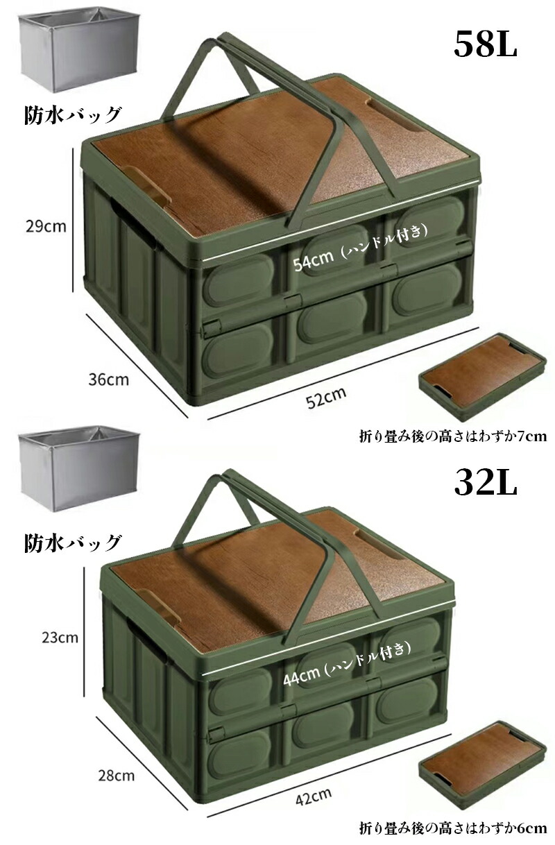 折りたたみバスケット コンテナボックス 58L 32L 防水袋付ける 持ち手付き コンパクト 折り畳み 大容量 大きい オリコン 折りコン 収納箱 ペットボトル ストック ローリングスト 収納ボックス