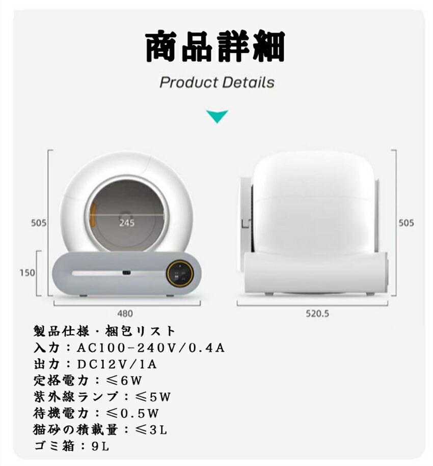 この猫用自動トイレは大容量9Lのゴミ箱が付き、猫が約8~10日間使用できます。このトイレの密閉性が良く、臭い漏れしにくい、砂の飛