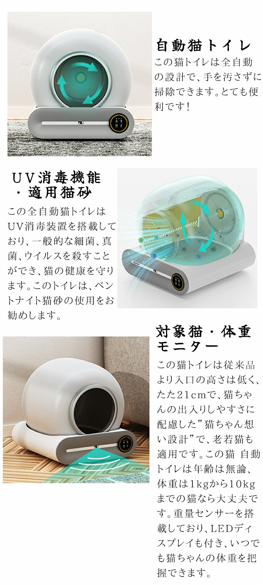 この猫トイレは従来品より入口の高さは低く、たた21cmで、猫ちゃんの出入りしやすさに配慮した”猫ちゃん想い設計”で、老若猫も適用です。この猫 自動トイレは年齢は無論、体重は1kgから10kgまでの猫なら大丈夫です。重量センサーを搭載しており、LEDディスプレイも付き、いつでも猫ちゃんの体重を把握できます。