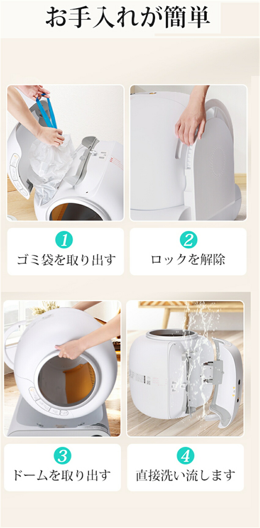 この自動猫トイレは愛猫に綺麗な環境を提供し、健康を保ってくれます。猫が用を済ませて機械から離れて30秒くらいし