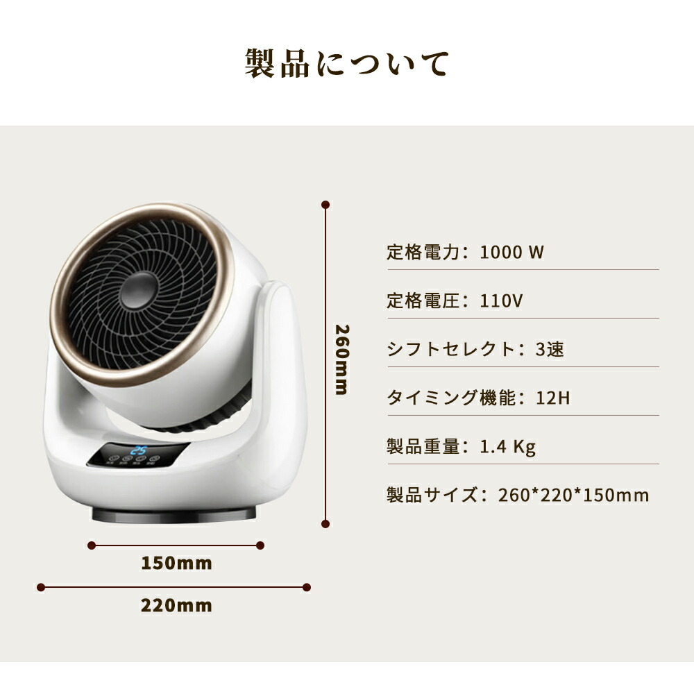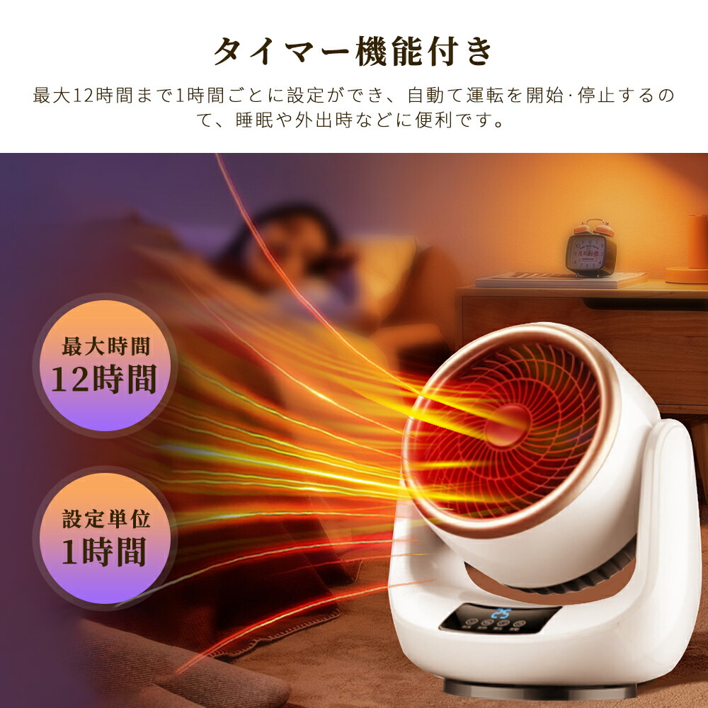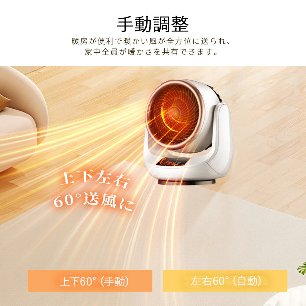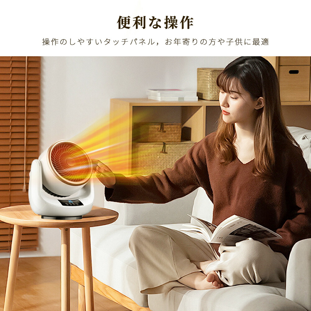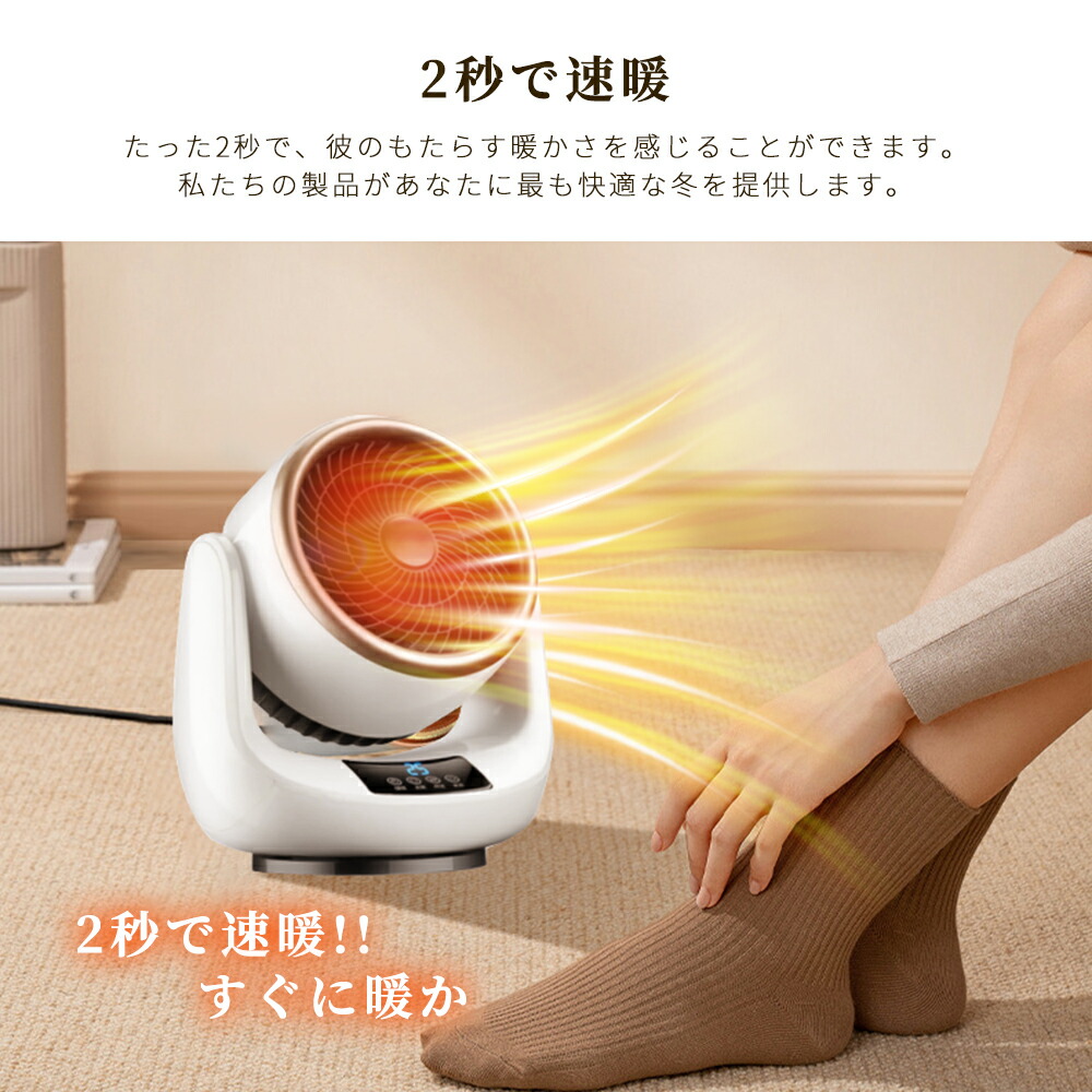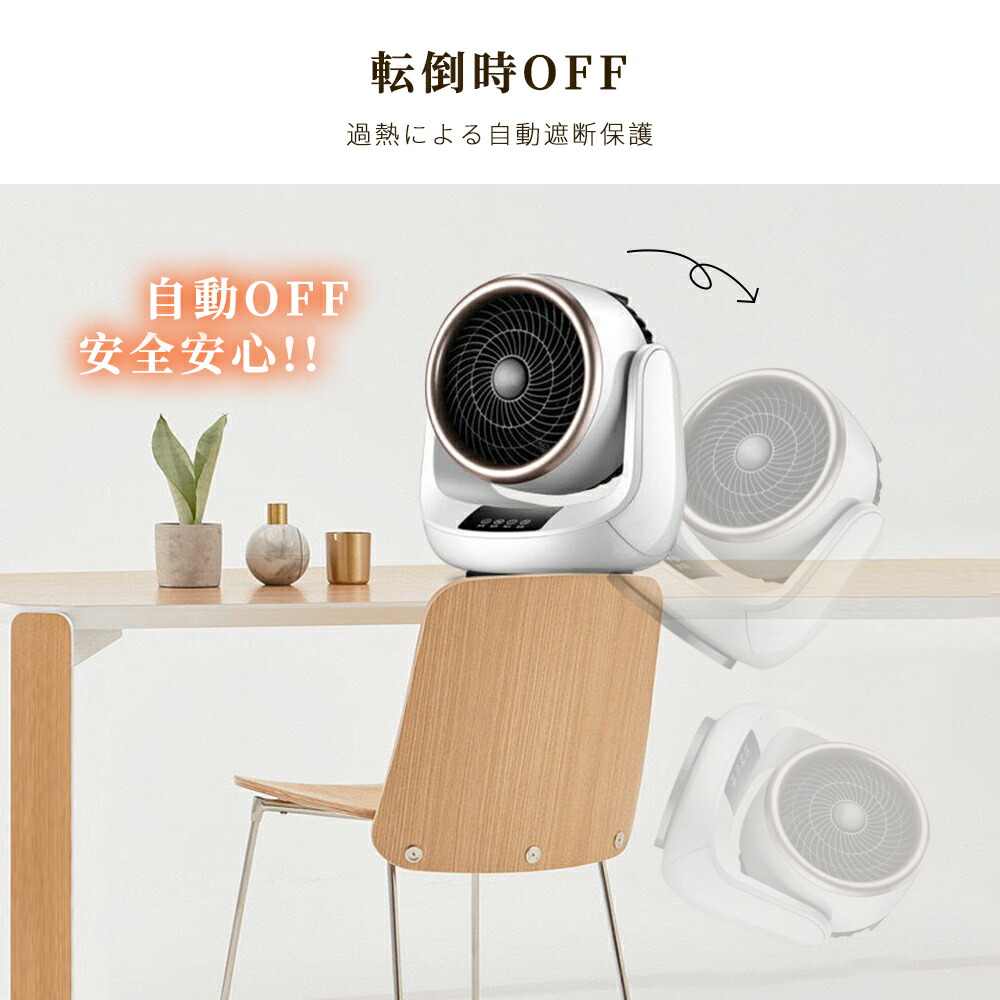 【安心・安全な機能】転倒自動OFF機能:地震や不意の転倒に備えた転倒時電源遮断装置を搭載しており、衝撃して転んだときに自動的に電源も切ります。 万が一不意の衝撃でもこの電気ヒーターが倒れても、自動的に電源が切ります。過熱防止機能:本体が連続運転によって過熱すると、自動的に過熱保護機能が起動され、電源が自動的に切ってくれます。直火なし:PTCセラミックを活用して発熱し温風で温めるため、ガスや石油などのオイルをを使わないため、明火なしに室内空気を汚さず、換気しにくい場所での使用にもビックリ!また本製品はPSE認証済み暖房器具です。赤ちゃんやペットのいるご家庭でも安心に使えます