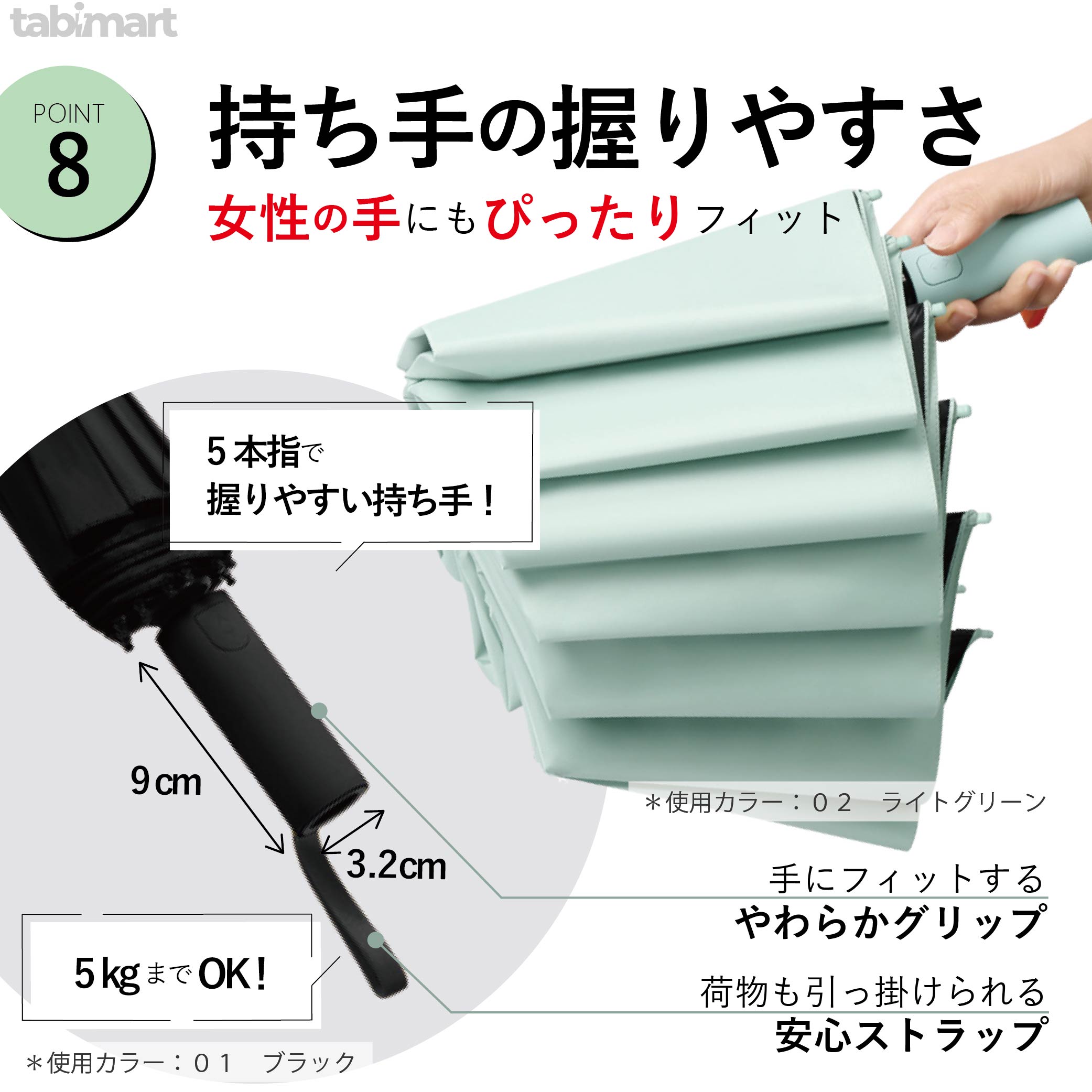 手のひらに沿う曲線形状とソフトなラバー素材を組み合わせ、長時間持っても痛くなりにくい設計。雨で濡れた手でも滑りにくく、ストラップは耐荷重5kgのナイロン製で安心して吊り下げ可能です。自転車やバイクのハンドル、カフェのイスなどに掛けやすい絶妙な長さで、傘の置き場に困るシーンを減らします。