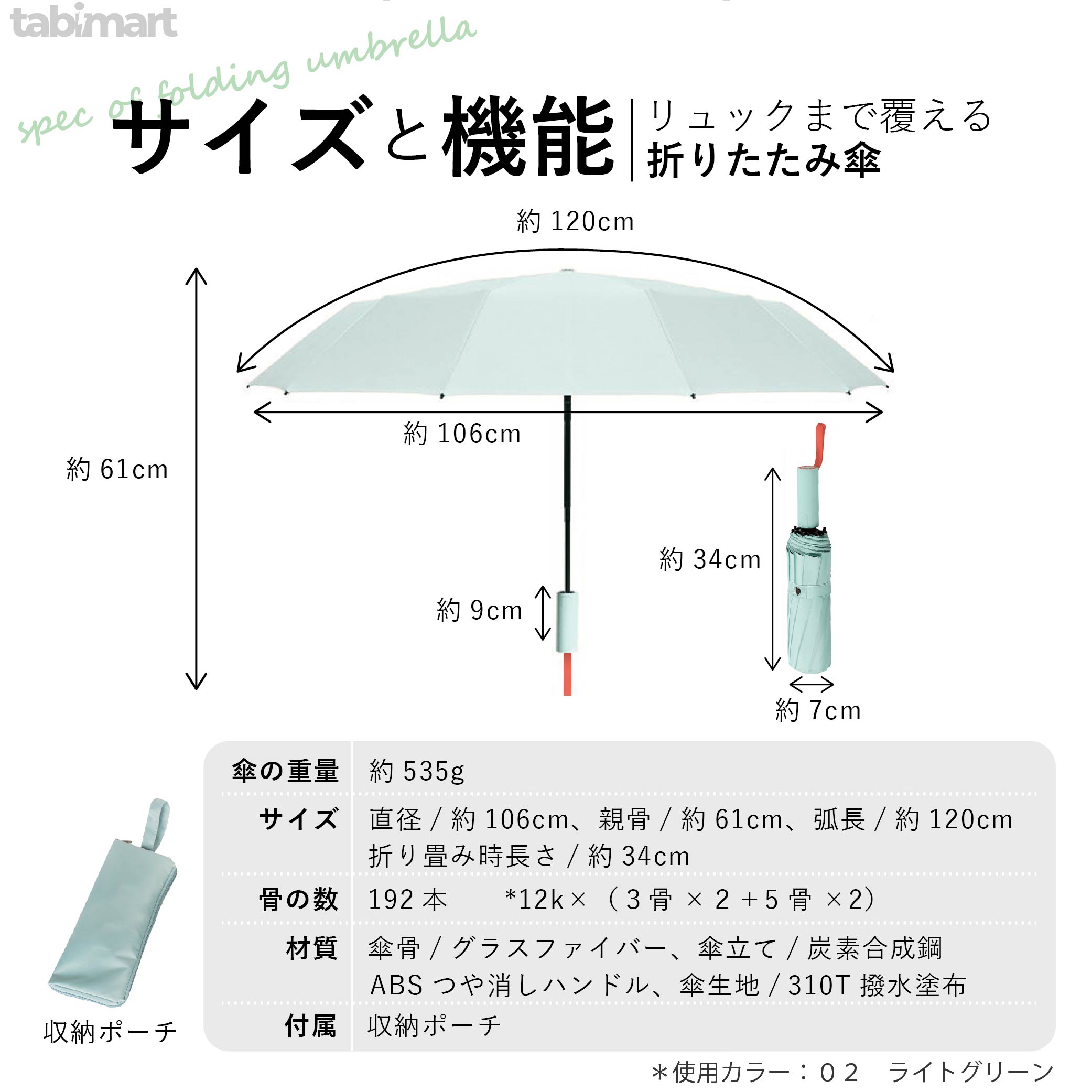 ペットボトル1本分に相当する約500gという軽さを実現。肉薄化したアルミシャフトと高剛性グラスファイバーを組み合わせることで、耐風性能を保ちながら軽量化を図りました。三つ折り時の全長は約33cmで、A4サイズのトートバッグやビジネスリュックのサイドポケットにすっきり収納。毎日持ち歩く折りたたみ傘は軽さこそ正義――そう感じるヘビーユーザーにこそ試してほしい携帯性です。