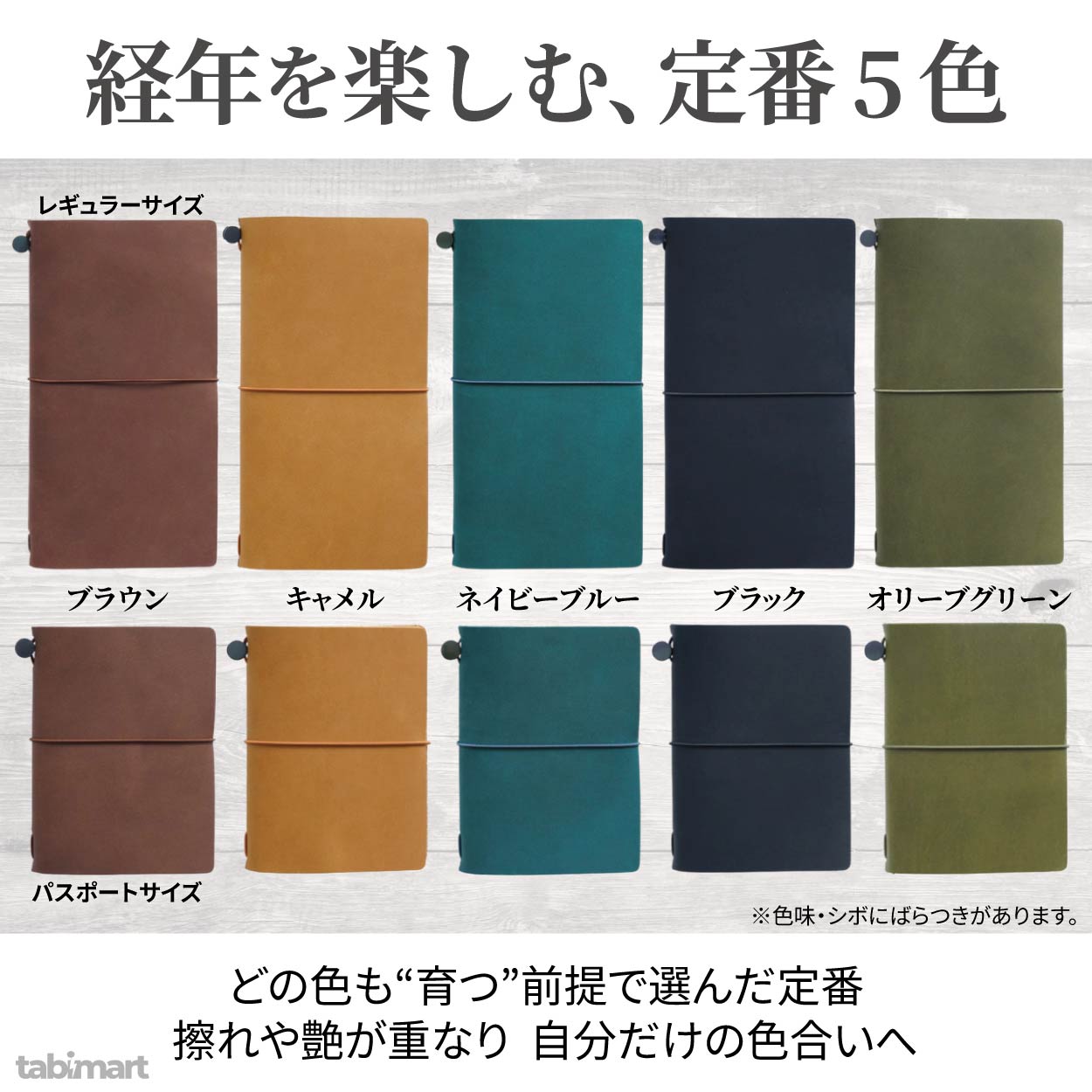 定番の5色(ブラック、ブラウン、キャメル、ネイビーブルー、オリーブ)を用意しました。いずれも落ち着いたトーンで、ビジネスにもカジュアルにも馴染みます。ブラックは引き締まった印象、ブラウンはクラシック、キャメルはエイジングの変化が分かりやすく、ブルーは知的で上品、オリーブはアウトドアや旅の雰囲気と好相性です。天然皮革ゆえ、同色でもシボや色味に個体差があり、擦れや艶が重なるほど唯一無二の表情に育ちます。男女兼用のユニセックス設計で、バッグや服の配色を問わず合わせやすく、季節を選ばず長く使えるのが魅力です。