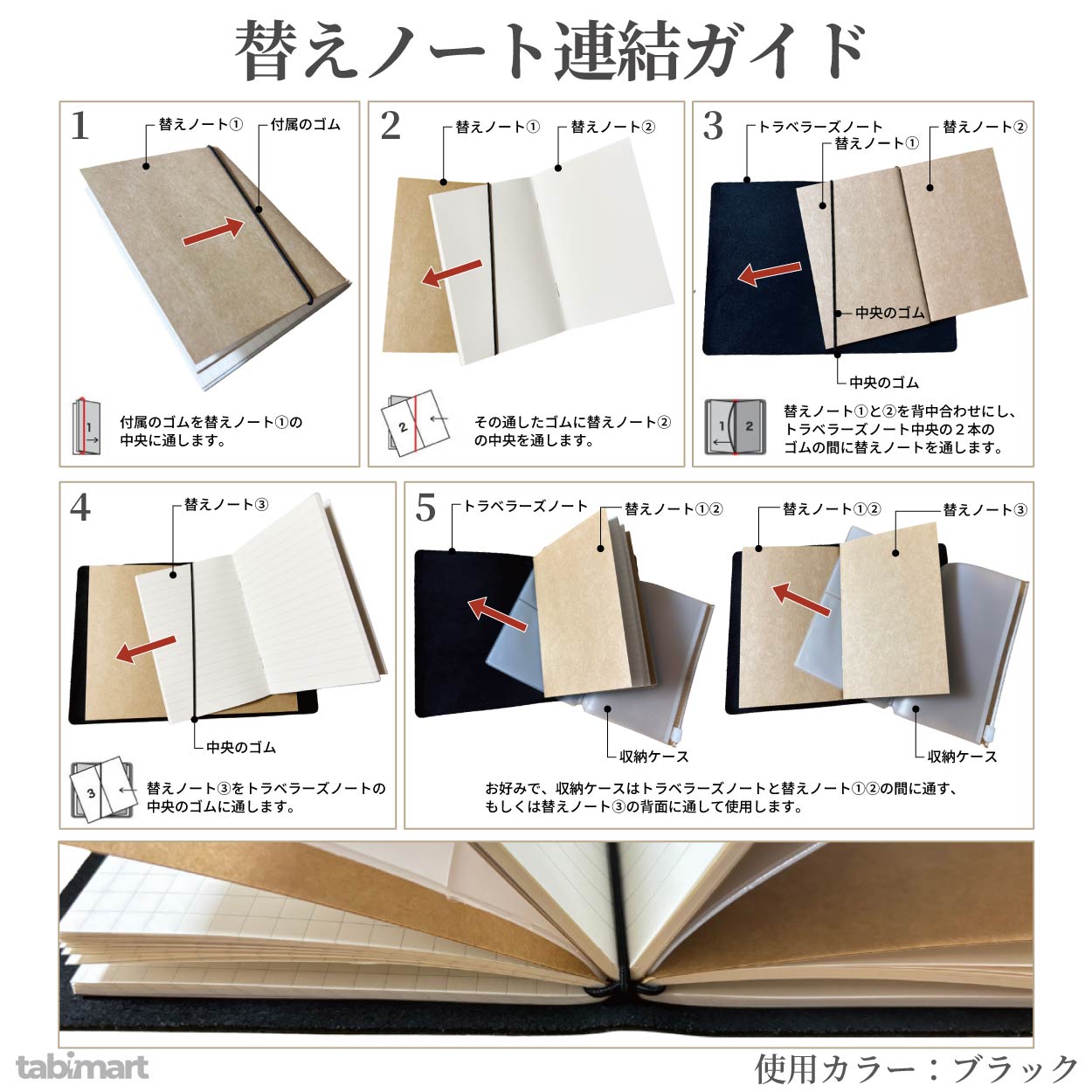 初回は、カバーを開き、中央の留めゴムにリフィルを一冊差し込みます。二冊運用する場合は、各リフィルの背中央にあるステープル同士を連結用ゴムで“背中合わせ”にしてから、束ねた背をカバーの留めゴムへ通します。これで開いた側がメモ、裏側がスクラップなど、役割を分けたまま一冊化できます。差し替えは、留めゴムから外して入れ替えるだけ。チケットやレシート類は、ジッパーケースやカードポケットにまとめると落下防止に有効です。