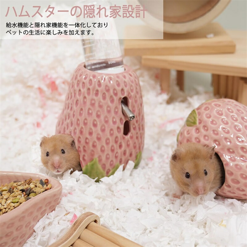 【2 in 1 隠れ家付きデザイン】 付属のスタンドが小型棲息空間を提供,ハムスターがスムーズに出入り・隠れられます。可愛らしいイチゴ造型ボトルはトンネルとしても機能,掘る・探検する本能を満足させます。