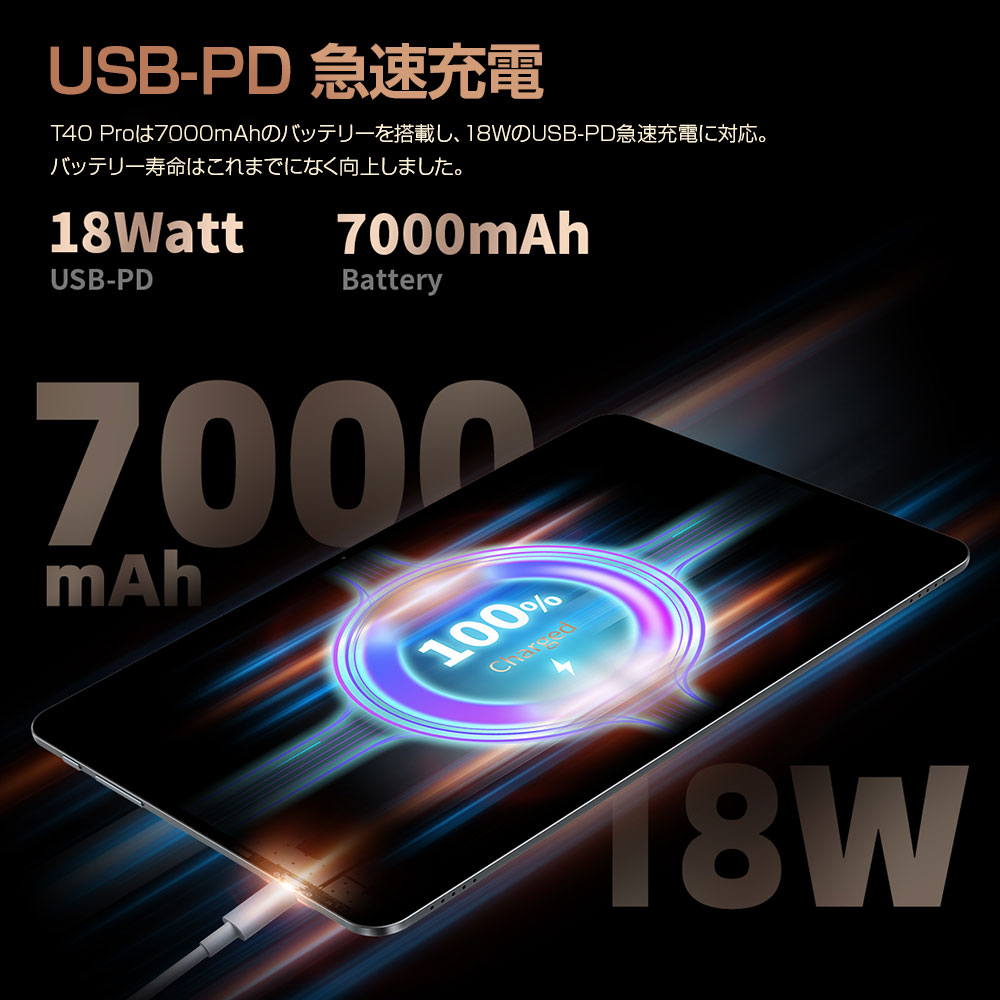 大容量バッテリー7000mAhを搭載し、18WのUSB-PD急速充電に対応。バッテリー残量を気にすることなく、音楽や動画を楽しめます。