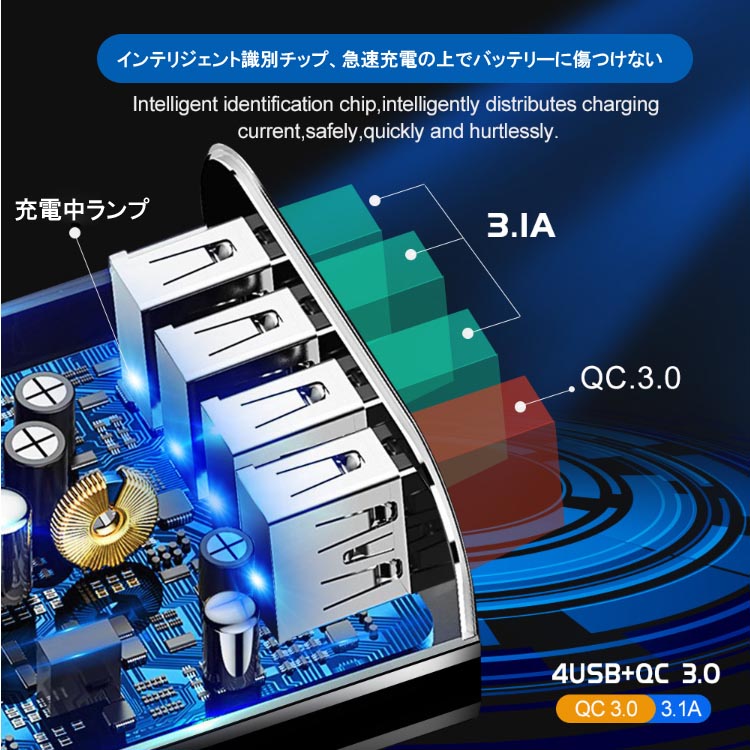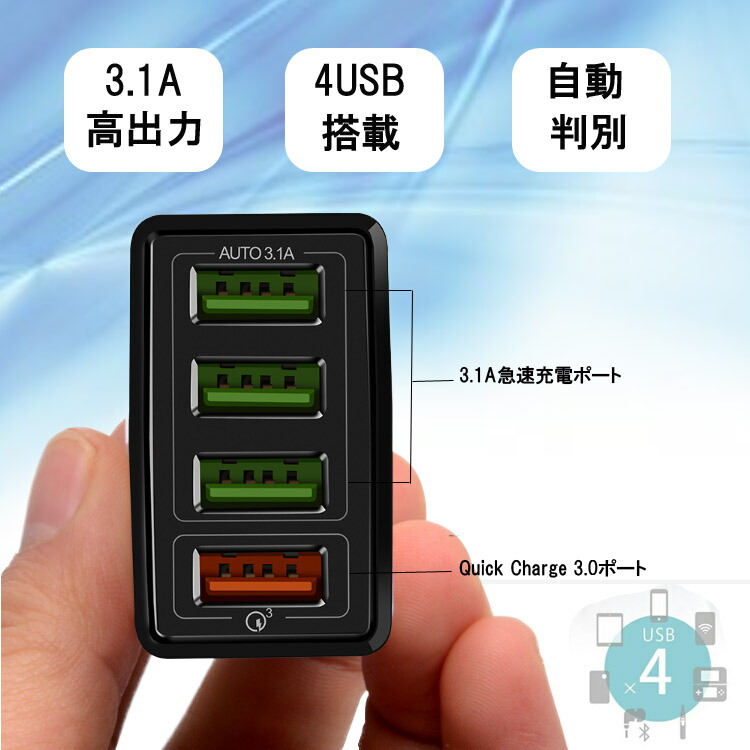 ACアダプター チャージャー USB4ポート USB急速充電器 3.1A超高出力 高速充電 急速出力 ハイパワー 電源アダプター 全ポート全てが急速充電対応 IOS Android対 4台同時充電可能