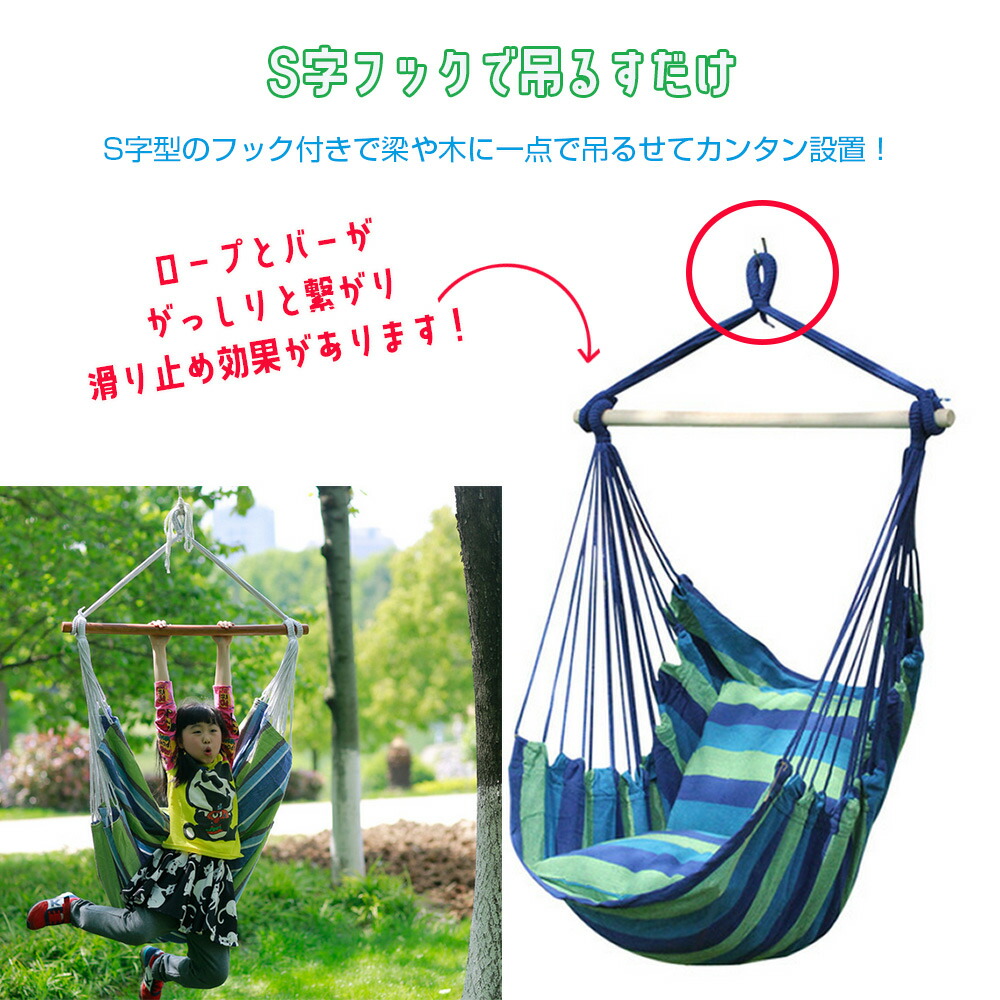 ハンモックチェアにはS字型のフックが備えており、梁や木に一点で吊るせるので設置はとても簡単♪