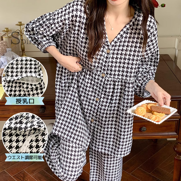 マタニティパジャマ 授乳口つき 半袖 キッズ ベビー マタニティ 人気 千鳥格子チェック 植物柄 M L XL 2XL 3XL