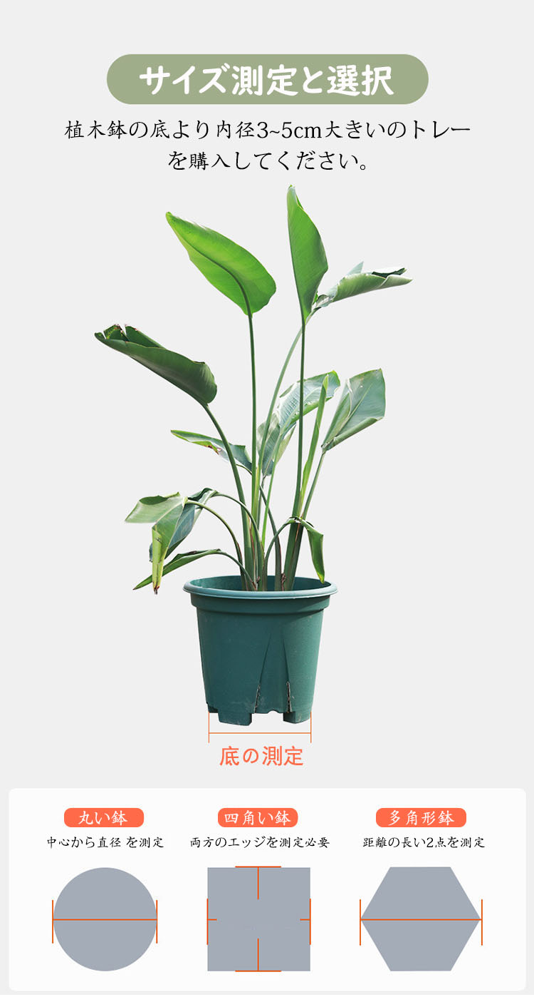 ※植木鉢台のサイズ:購入前に植木鉢の底部の直径を測定し、植木鉢の底部の直径より内径3~5cm大きいのトレーを購入してください。