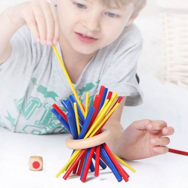 29点セット:赤スティッキー9本、黄スティッキー9本、青スティッキー9本、リング1個、サイコロ1個。遊び方の説明1、全てのスティックを束にして片手で握ってください。2、木の輪を束の上から通して真ん中まで下ろし、ゆっくりと束から手を離して下さい。3、全体が動かなくなったら、ゲーム準備が完了です。4、プレーヤは順番にサイコロを投げて下さい。5、全体が崩さないように注意しながら出たサイコロの色のステイックを取り出して下さい。6、全体が崩したら(または、スティックが3本しか残らなかった場合)ゲームは終了します。全員は自分の得点を計算し、最も得点が高い人は勝ちです。