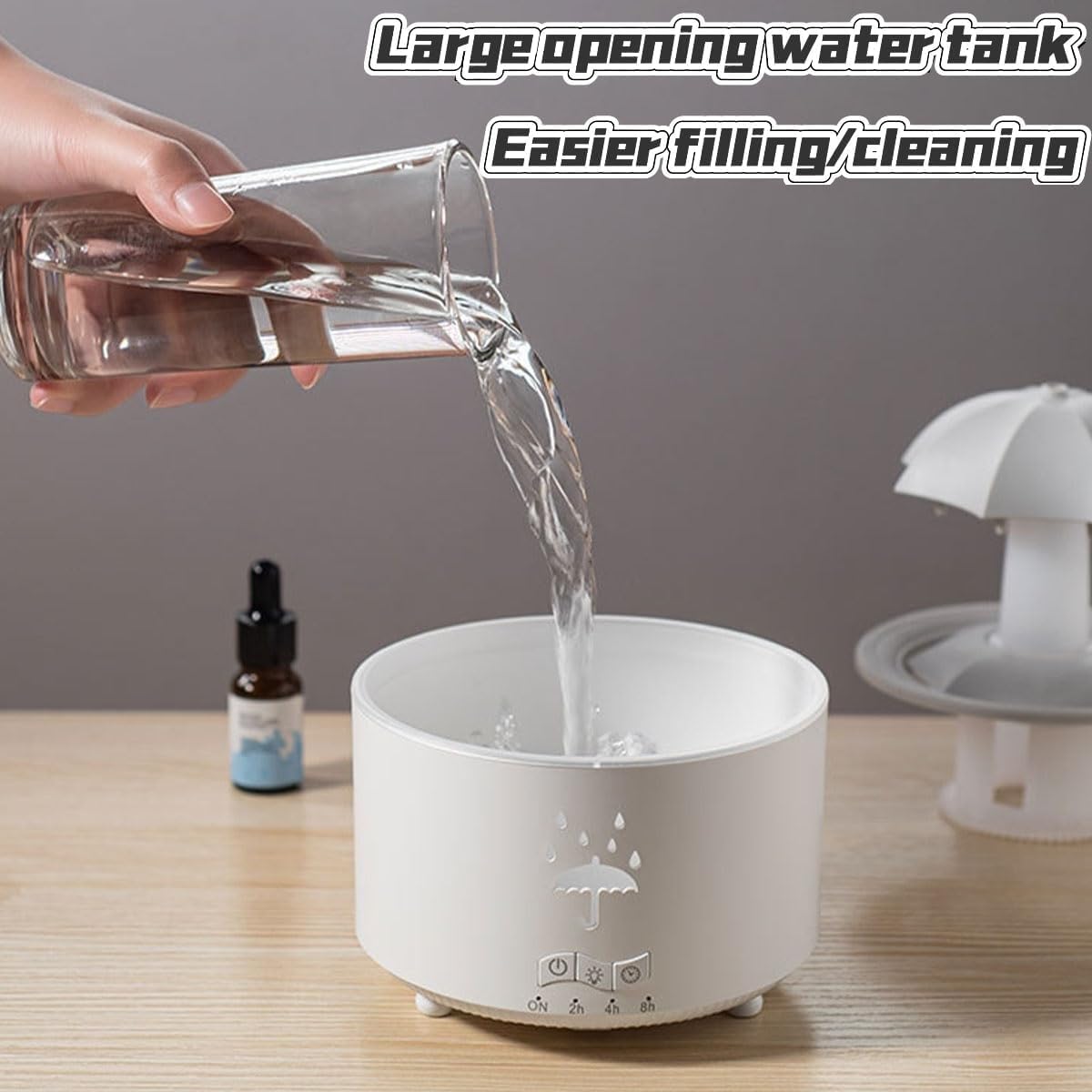 雨をイメージしたリラクゼーション: 穏やかな雨の音を模倣し、心を落ち着かせるミストを生成するように設計されたレインエフェクト付きアンブレラディフューザーで、心地よいリラクゼーションを体験してください。穏やかな回転と柔らかなLEDライトがリラクゼーション体験を高め、読書や瞑想に最適です。自然を室内に取り入れてストレスを解消しましょう。
