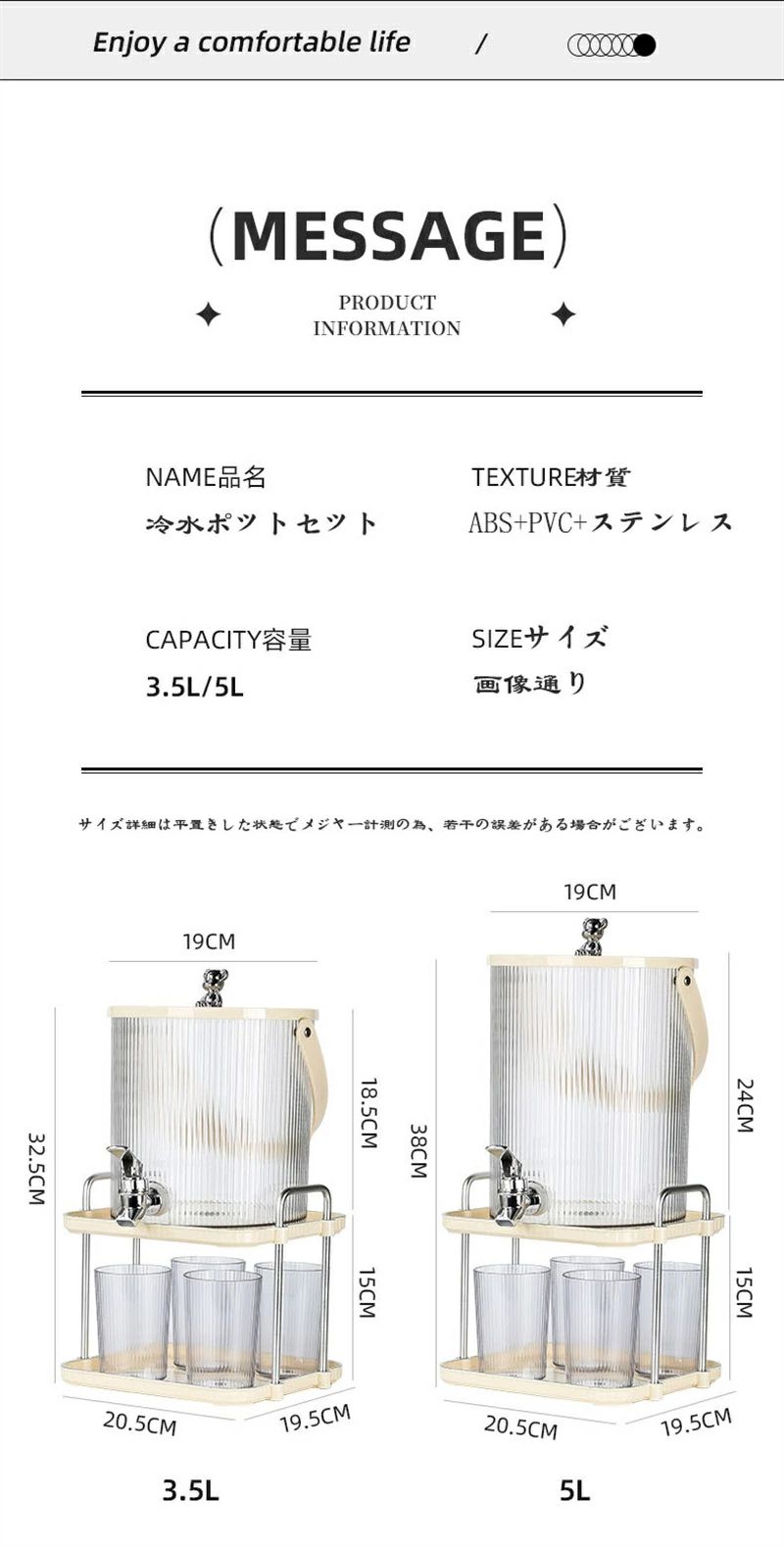 冷水ポットセット 蛇口付き コップ4個 コーヒー お茶用品 ピッチャー 冷水筒 豊富 5L 3.5L