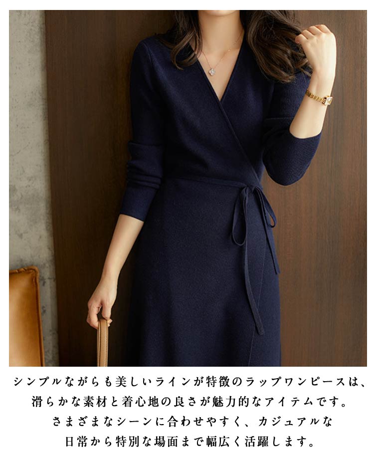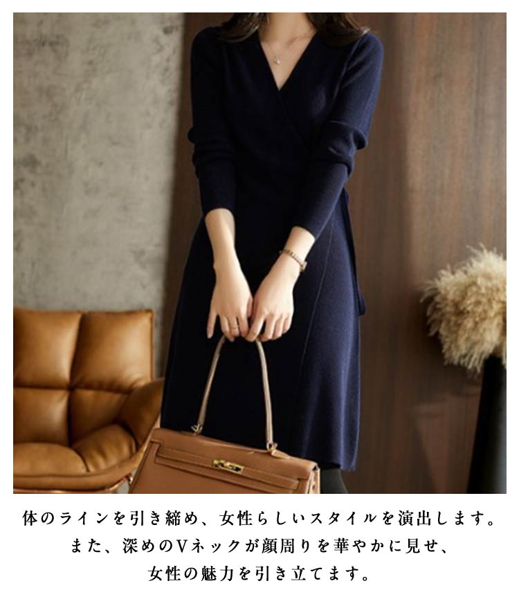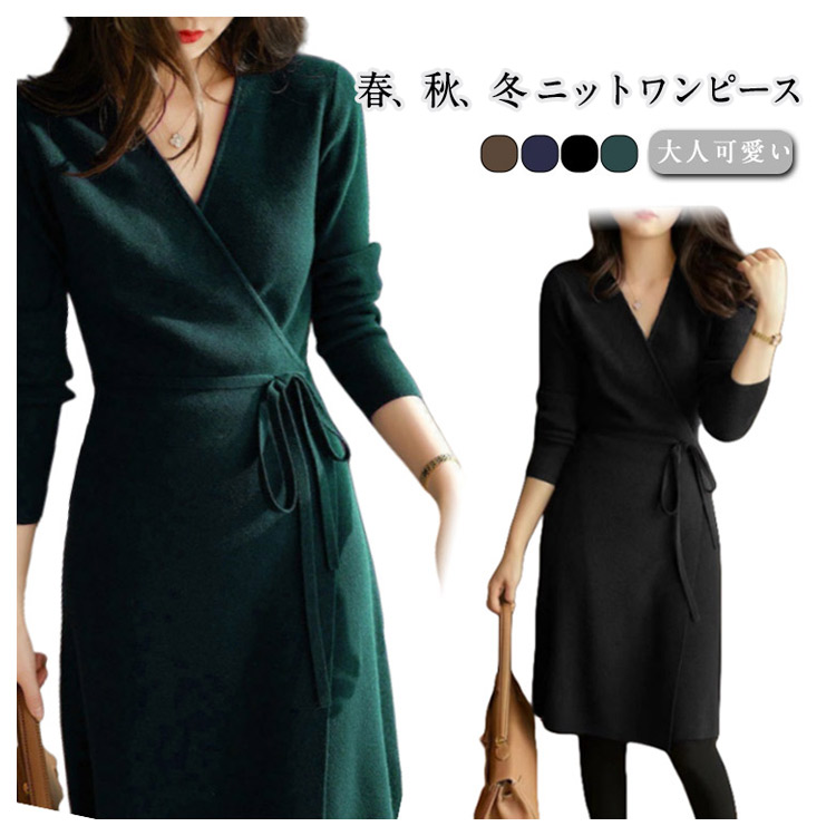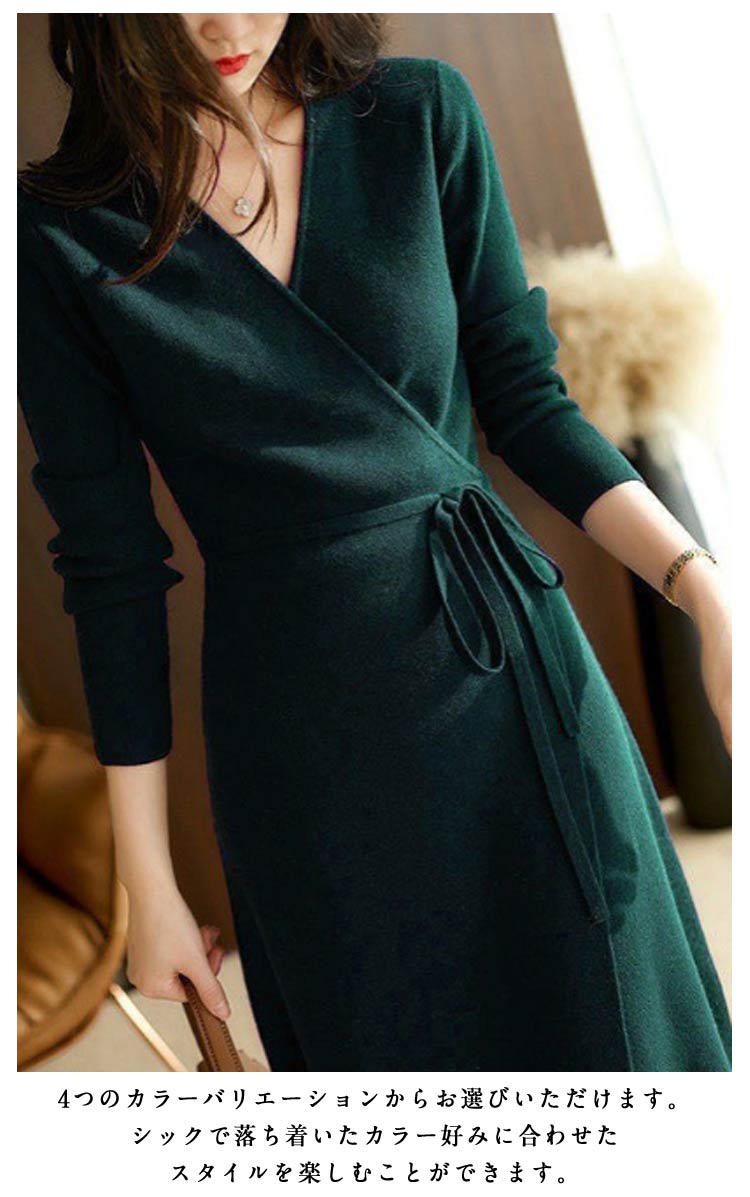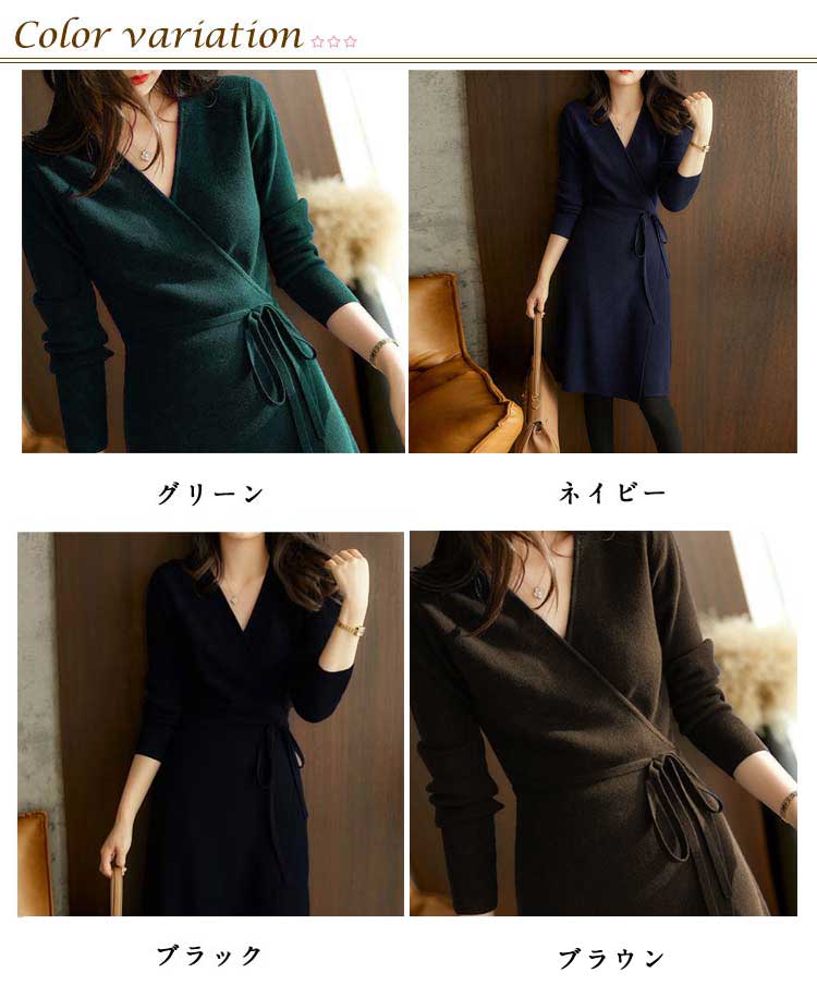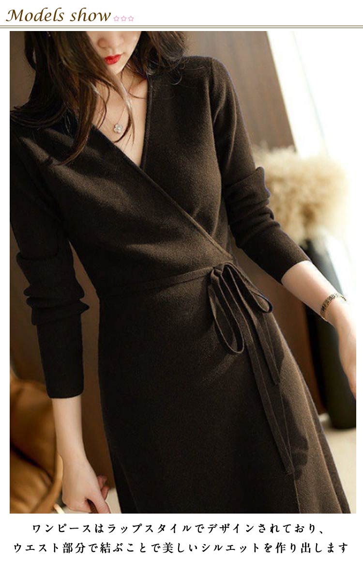 タイト 長袖 vネック 秋冬 ラップワ レディースファッション 超目玉商品 ネイビー グリーン ブラウン ブラック