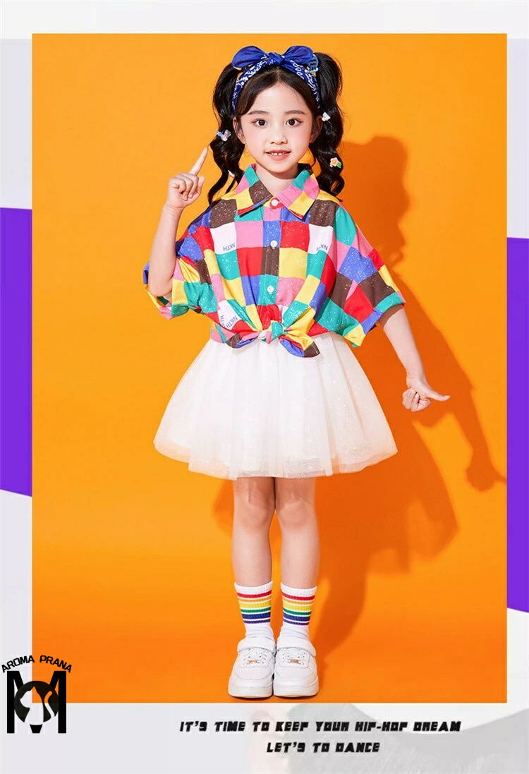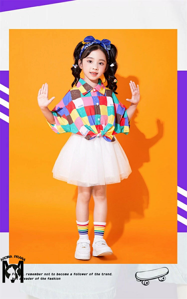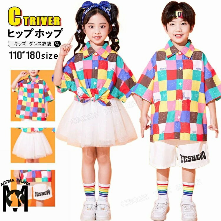 虹色 キッズダンス衣装 セットアップ チェック柄 チアガール パンツ スカート シャツ k-pop 衣装 半袖 カラフル ヒップホップ 男の子 女の子 韓国 カッコイイ 子供 演出服 ジ キッズダンス