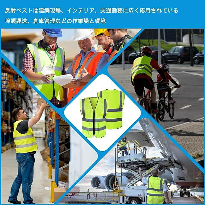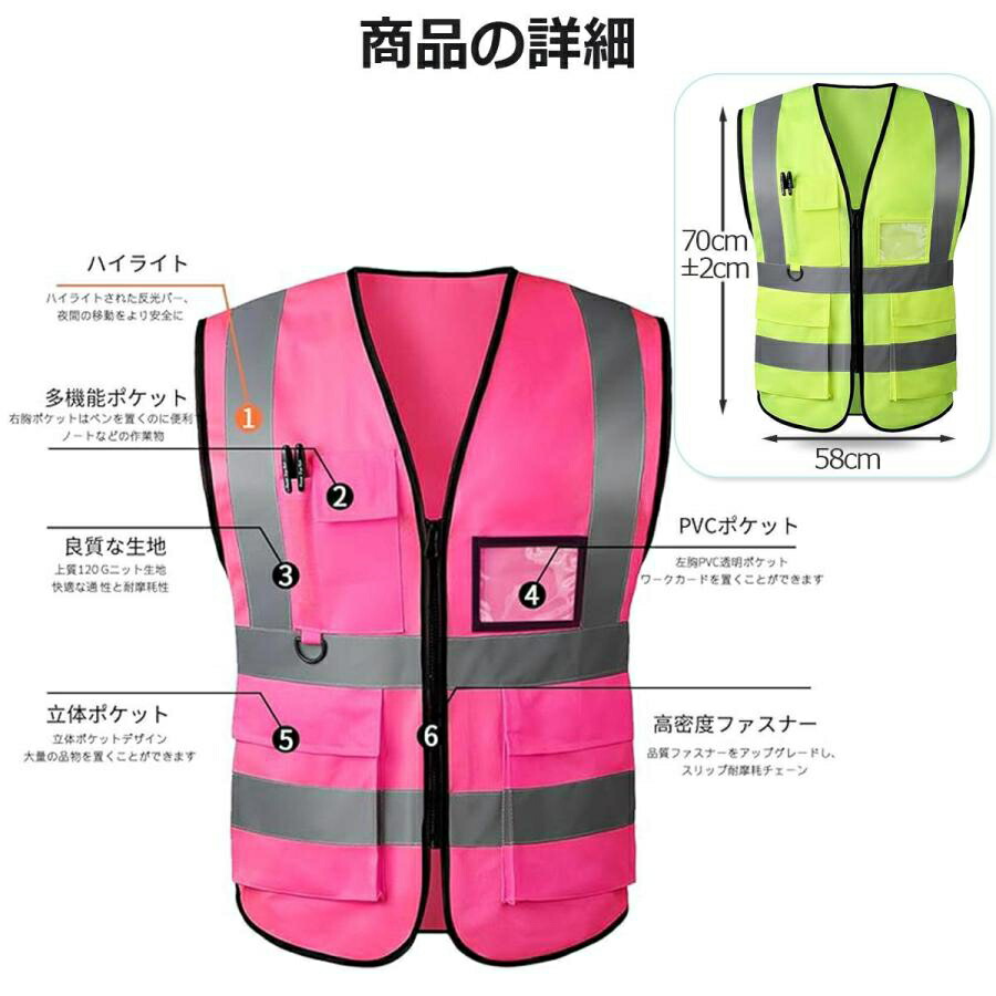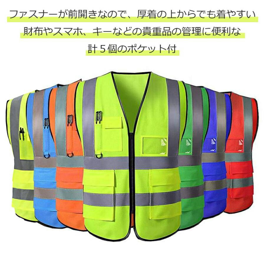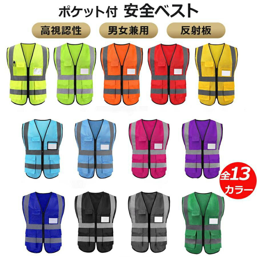 13色5ポケット付 安全ベスト 反射ベ 蛍光レモン レモン オレンジ レッド イエロー スカイブルー ブルー ピンク パープル ロイヤルブルー ブラック グレー グリーン