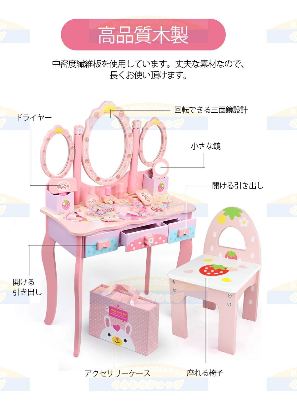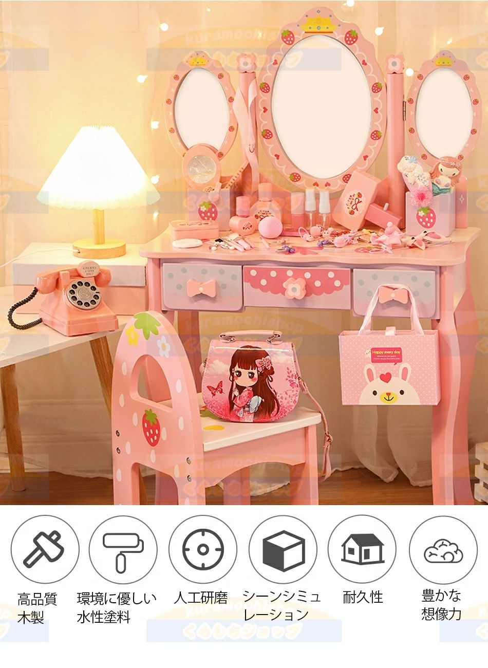 【3つの引き出し】お子様が化粧品や筆記用具を保管するのに役立ち、遊びの中で生活力が鍛えられます。