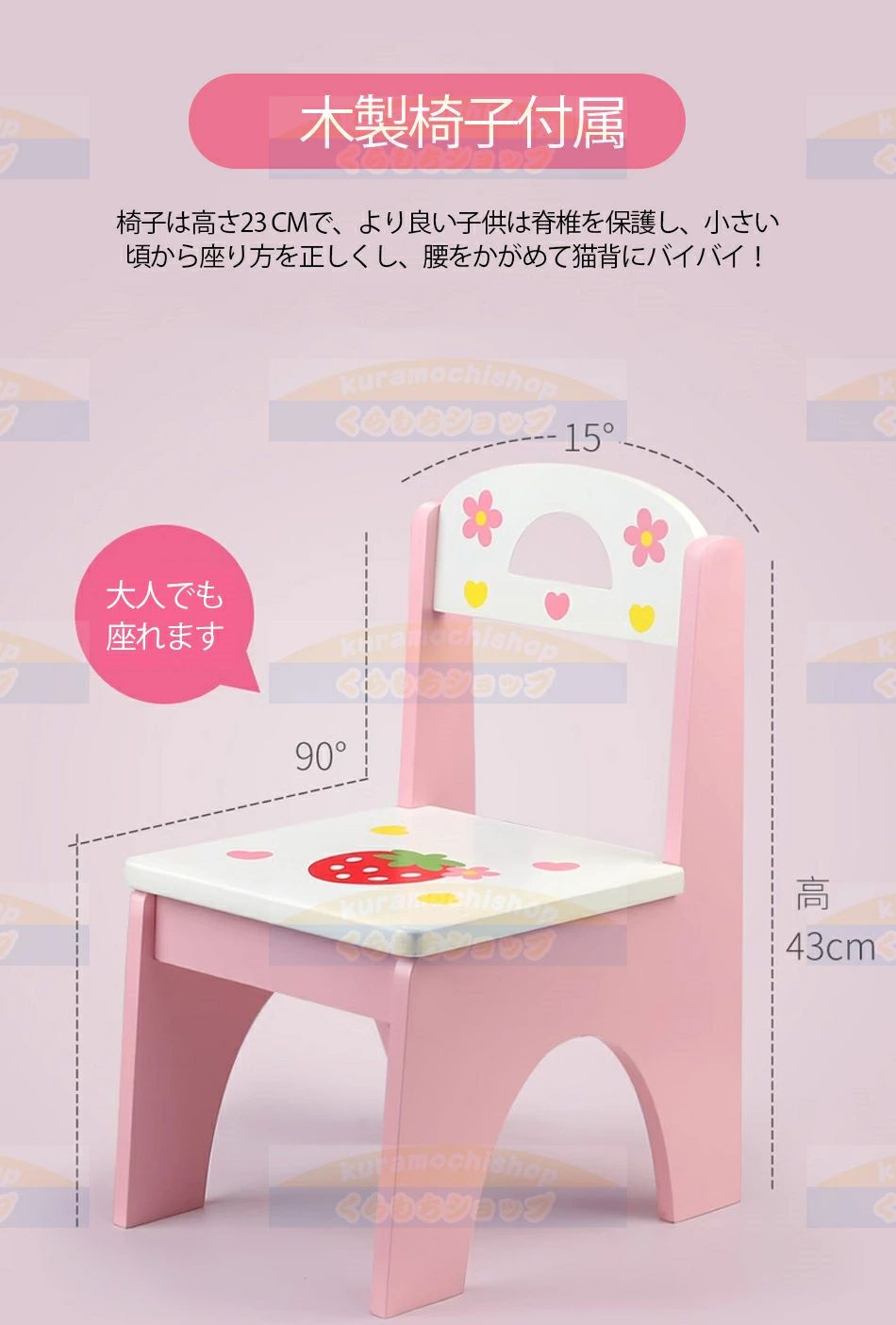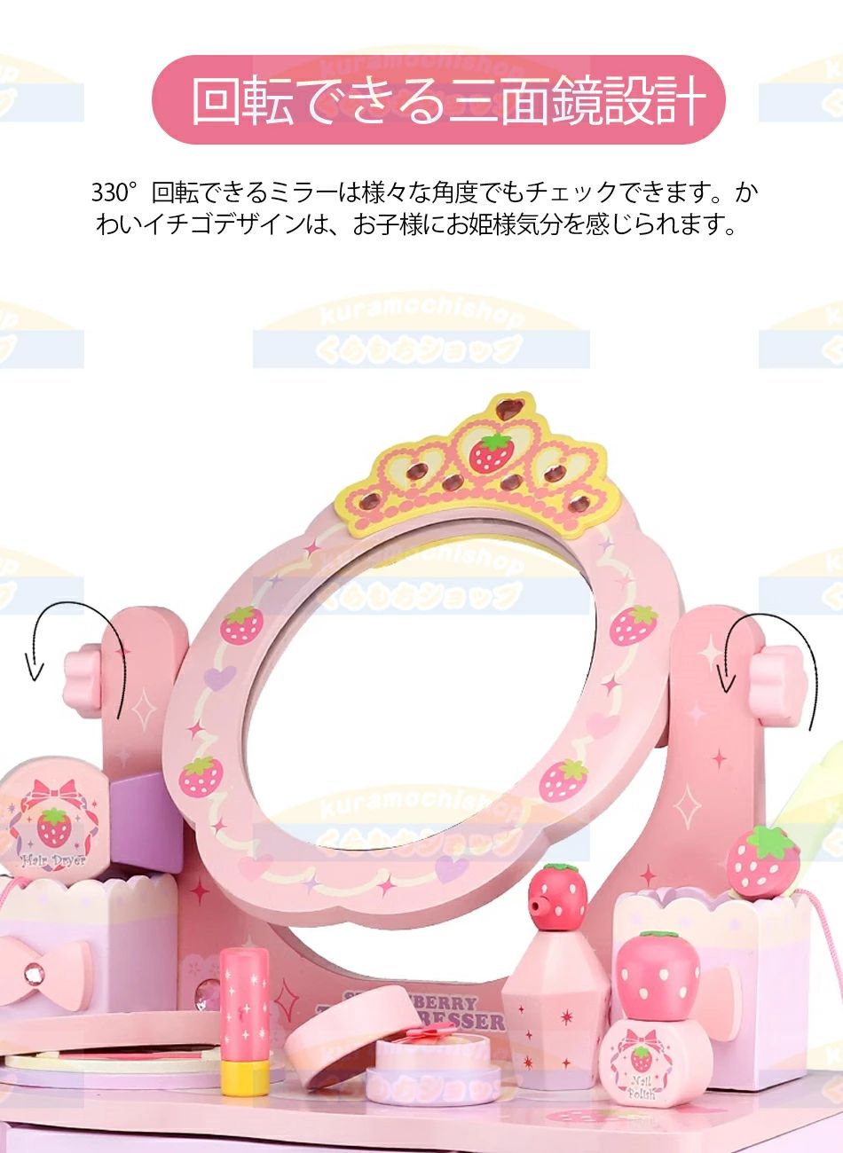 【中段360°回転できる三面鏡設計】360°回転できるミラーは様々な角度でもチェックできます。かわいイチゴデザインは、お子様にお姫様気分を感じられます。