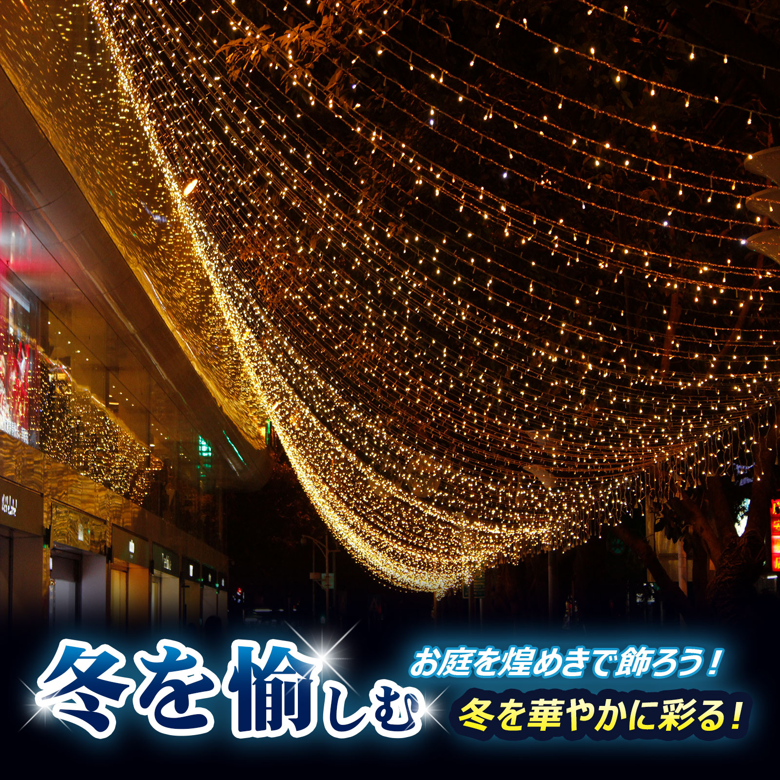 オススメポイント 高輝度LED球 弊社で取り扱っておりますイルミは格段に明るく美しい発光が特徴のLEDで、高輝度省電力長寿命です。 広拡散LEDを採用して一粒一粒が明るくてどこから見ても明るく見える広角拡散パッケージです。 光線が柔らかく鮮やかに光って、幻の感じを作成できます。 長寿命省エネ 消費電力は従来のミニライト等と比べると、約1/5~1/10で小さく電球の寿命も長いので、とっても経済的です。 また低電圧のため消費電力が低くランニングコストを抑えたご利用が可能です。 PSE認証済 日本の電気用品安全法(PSE)の技術基準に適合した安全性の高い商品です。 8点灯パターン防水加工 コントローラーを使い点灯パターンを設定できます。 賑やかなシーンもロマンティックなシーンもお好みに合わせて演出できます。 お好みの点灯パターンを設定すれば美しいイルミネーションが楽しめます。屋外使用でも安心! LED部分が防水加工で、コントローラー部分が防滴加工です。室内屋外兼用!(防水PP袋付属) 点滅パターン: 1.Combination:2から8までを順番に繰り返す 2.In Waves:波のように点滅 3.Sequential:順番にゆっくり点灯 4.Slo-glo:ゆっくり点灯しゆっくり消える 5.Chasing Flash:激しく点滅 6.Slow Fade:全電球ゆっくり点灯ゆっくり消灯 7.Twinkle Flash:全電球が一度にまたたく 8.Steady on:全てが常時点灯する 適用場所 クリスマスシーズンには勿論、年末年始やパーティ(ハロウィンやクリスマスなど)、 お祭り、 バランタインなどお祝いイベント等あらゆる場面で大活躍間違いなし! ご家庭やお店、広場やパーティ会場を綺麗に彩ります。 省エネと発光色の多様化により、今や老若男女問わず大人気中のLEDイルミネーションをどうぞお楽しみください。 クリスマスツリーのデコレーションに最適です!