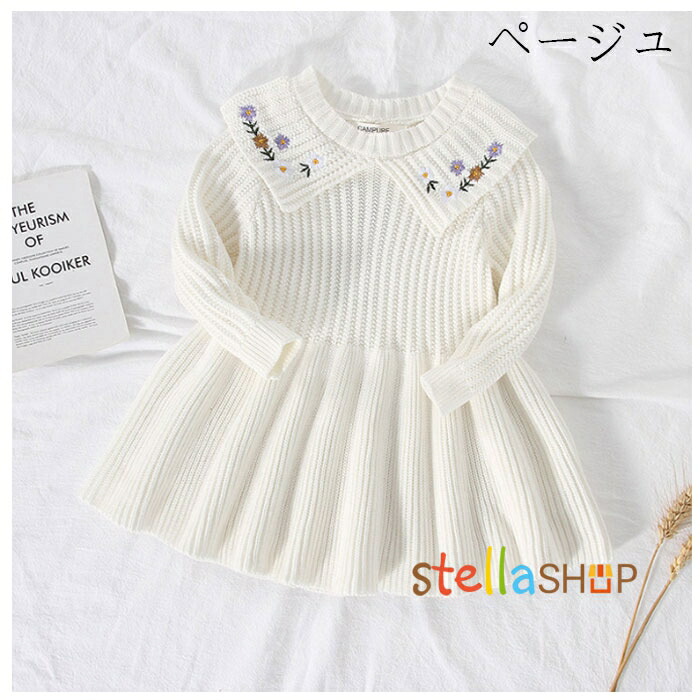 ニット ワンピース 女の子 花柄 刺繍 キッズ ワンピース 豊富な品揃え レッド ページュ 90 100 110 120 130 140