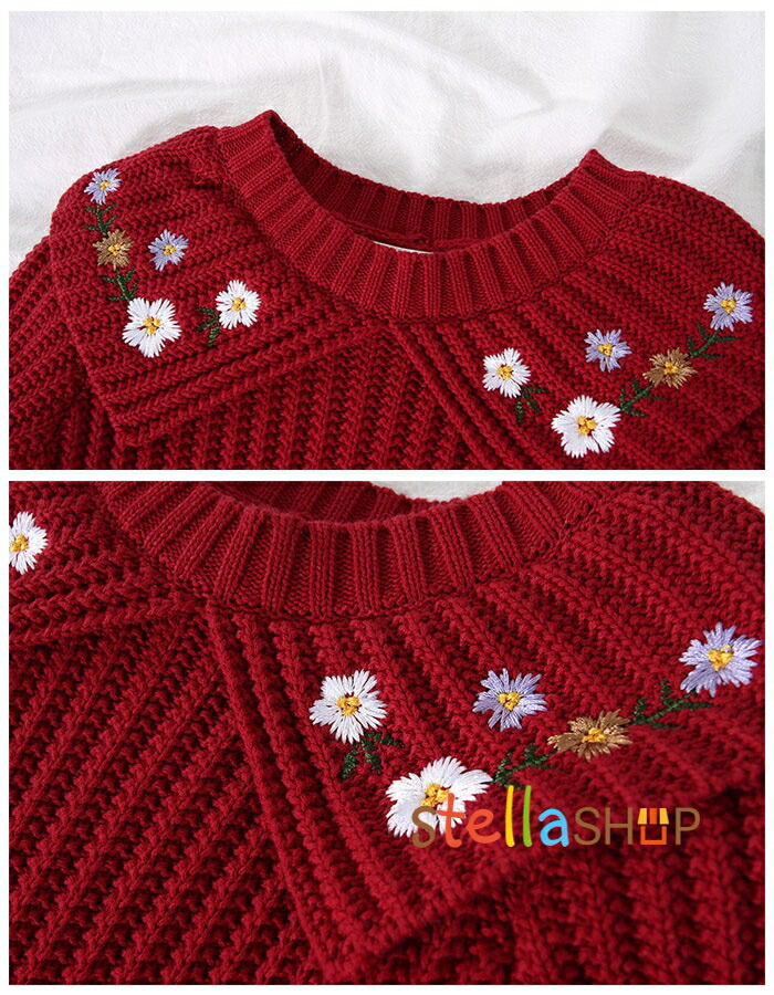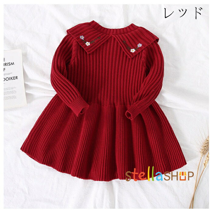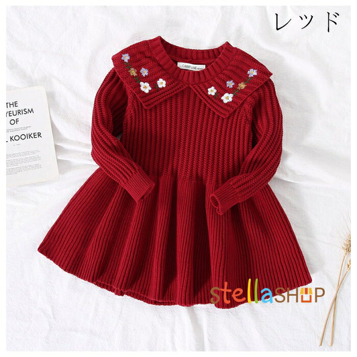 ニット ワンピース 女の子 ワンピース 花柄 刺繍 ワンピース おしゃれ レッド ページュ キッズ 長袖 ワンピース フォーマル 結婚式 姉妹 双子 ニット ワンピース 韓国子供服 普段着 通学 通園 誕生日 呼ばれ ワンピー ワンピ 秋着 冬着 90cm 100cm 110cm 120cm 130cm 140cm