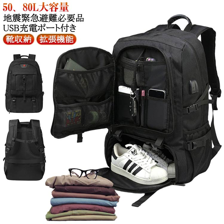 【50、80L大容量】【地震 緊急避難必要品 50L 80L 拡張機能 USB充電ポート付き 靴収納 拡張機能】