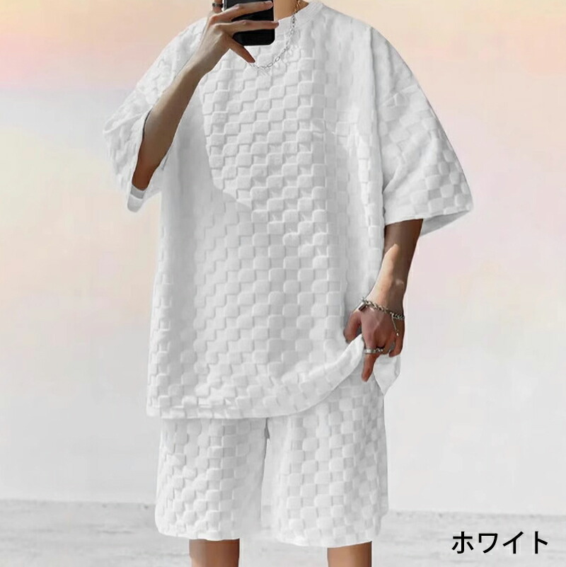 tシャツ 上下セット メンズ チェック スーツ セットアップ スーツ 人気 ホワイト ブラック グレー ベージュ S M L XL 2XL 3XL