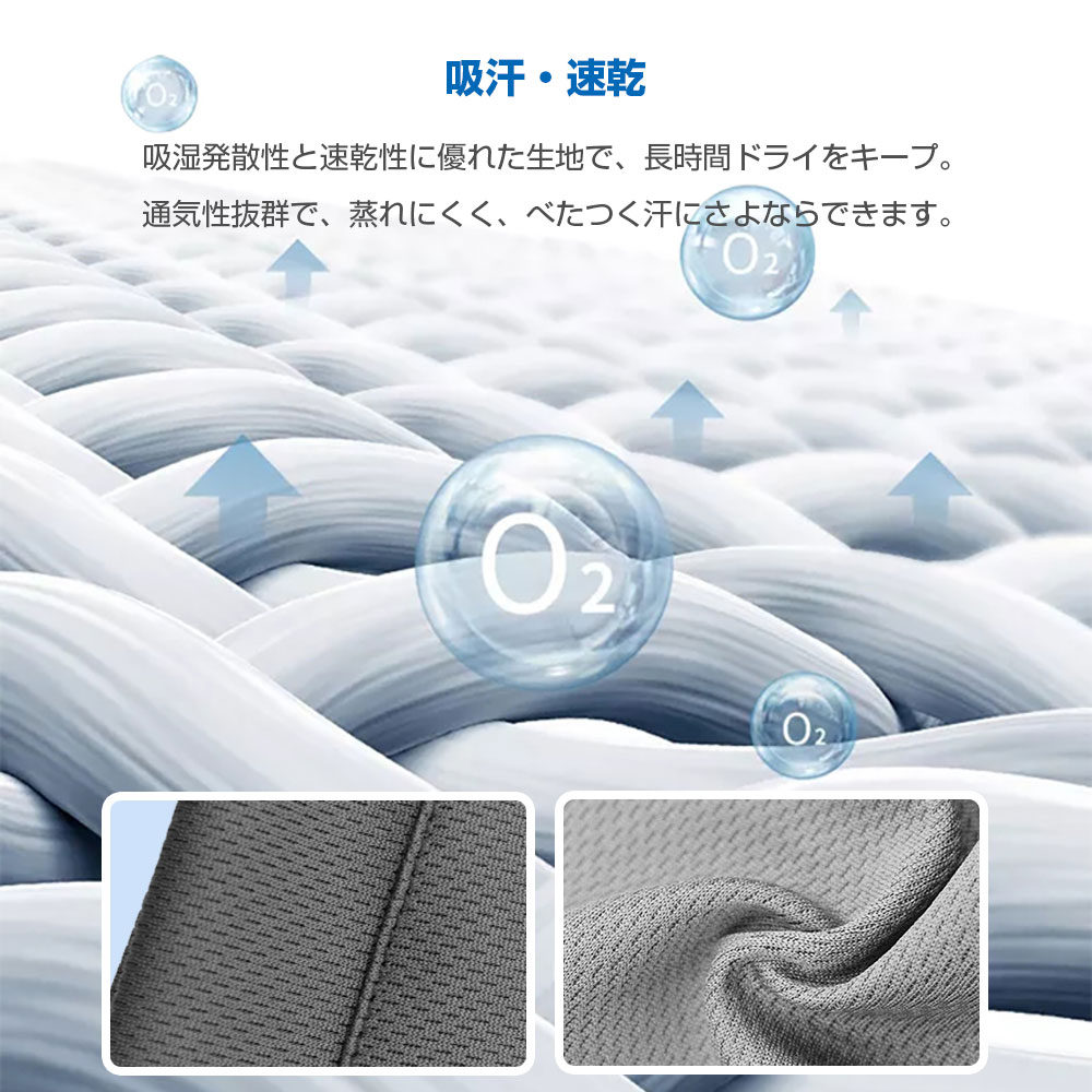 吸湿発汗性と速乾性に優れた生地で、長時間ドライをキープ。通気性抜群で、蒸れにくく、べたつく汗にさよならできます。