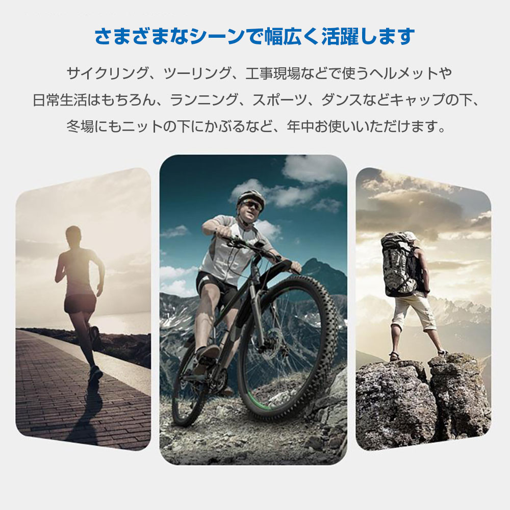 サイクリング、ツーリング、工事現場などで使うヘルメットや、日常生活はもちろん、ランニング、スポーツ、ダンスなどキャップの下、冬場にもニットの下にかぶるなど、年中様々なシーンにお使いいただけます。
