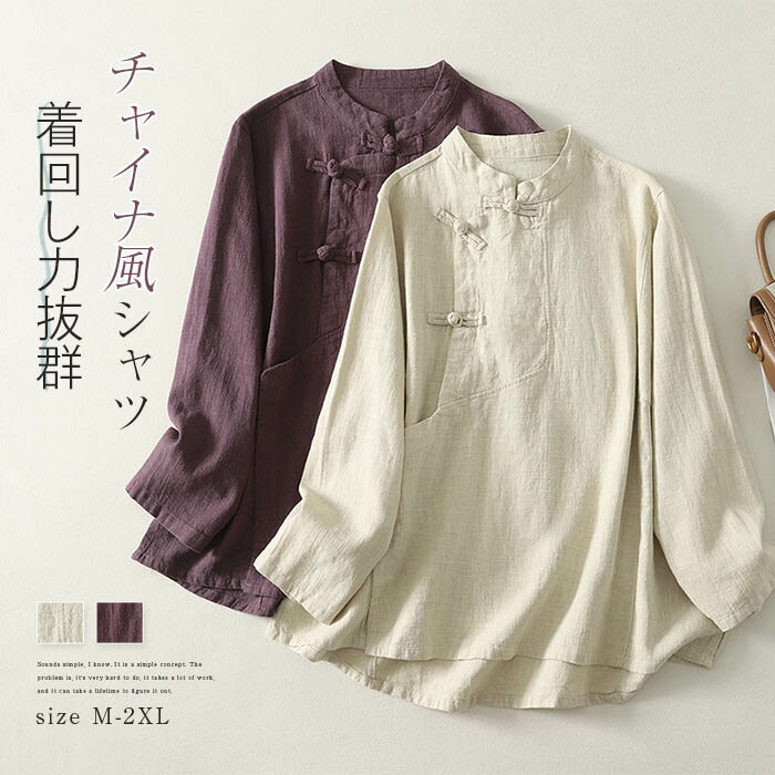 シャツ ブラウス チャイナ風 綿麻調 トップス シャツ ブラウス 新登場! ベージュ パープル M L XL 2XL