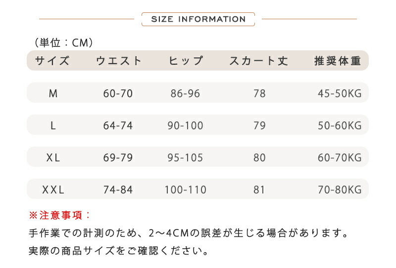 XXLサイズ:ウエスト74~84cm、ヒップ100~110cm、スカート丈81cm、推奨体重70~80kg