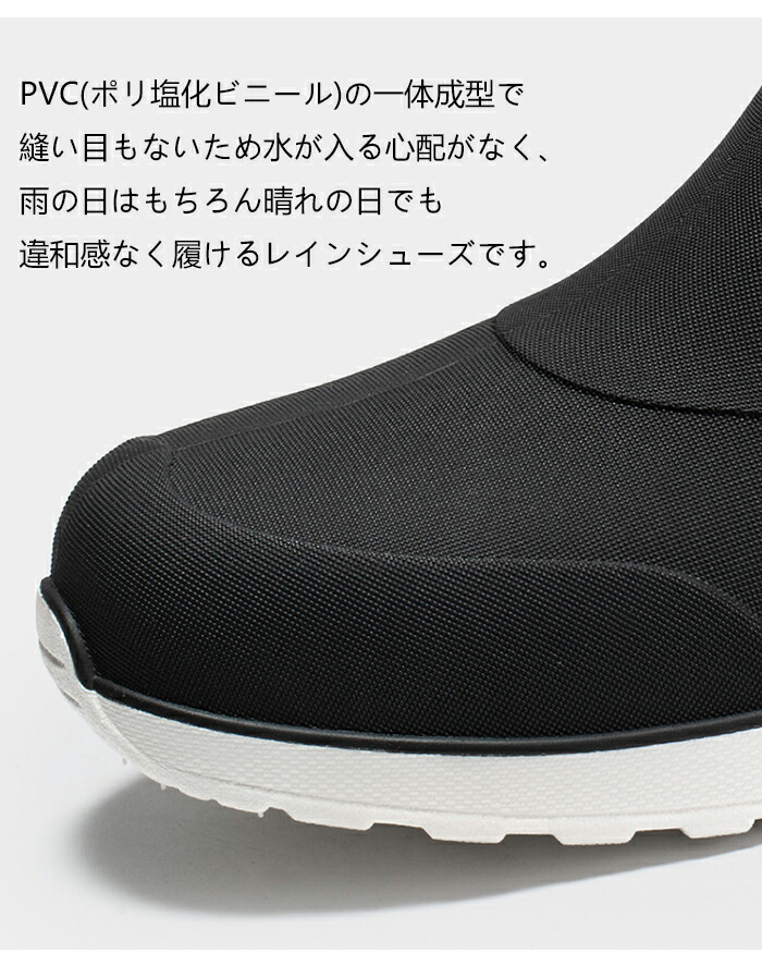 ポリ塩化ビニールの一体成型で縫い目もないため水が入る心配がなく、 雨の日はもちろん 晴れの日でも違和感なく履けるレインシューズです。