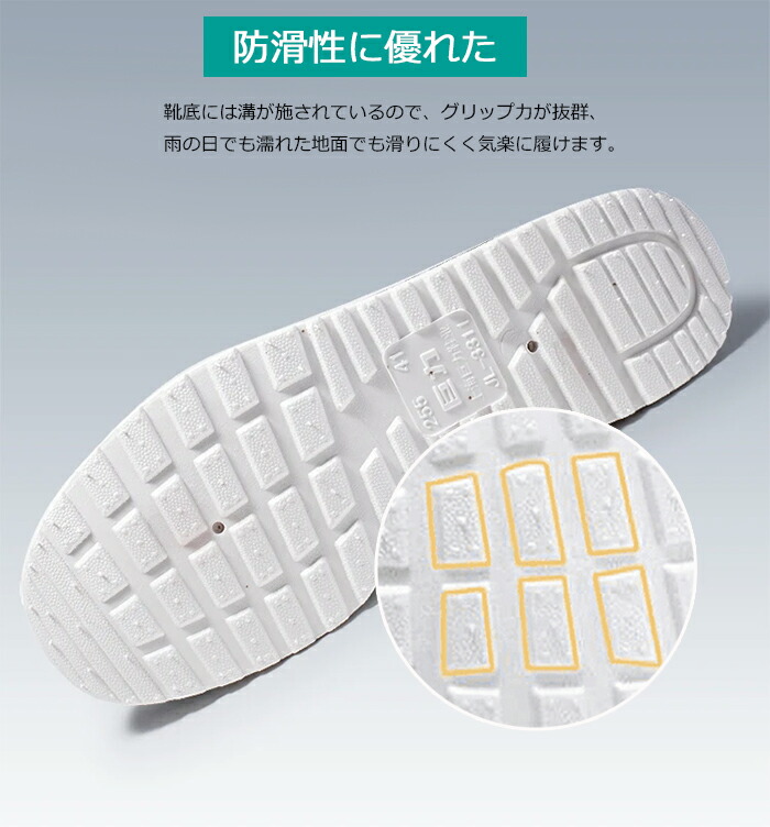 靴底に深い溝が施されており、滑りにくくなっています。 特殊加工によって濡れ た場所でもグリップカを発揮し、摩擦耐性を実現しました。